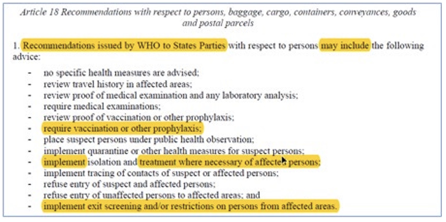 2. If the Federal government doesn’t intend to comply with binding WHO public health “recommendations,” why is it supporting the power transfer? What would the sanctions be for non-compliance? (See here for a good discussion of the likely influence of the amendments despite the lack of formal enforcement mechanisms.)