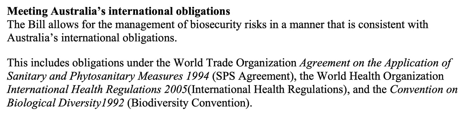 The government’s Explanatory Memorandum for the Bill which became the Biosecurity Act 2015 clearly states the intention was to enable Australia to comply with our international legal obligations including the International Health Regulations (see screenshot below):