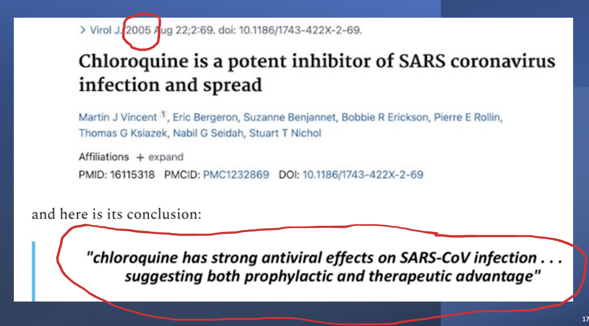 By 2005, scientists at CDC and in Canada, not to be outdone, showed exactly the same thing: it could be used for prevention or treatment. AND it stopped transmission, unlike the vaccines that Rochelle Walensky admitted in August 2021 “could no longer do.” Let me repeat myself: the US CDC knew in 2005 that chloroquine worked to prevent or treat the SARS-1 coronavirus. They KNEW.