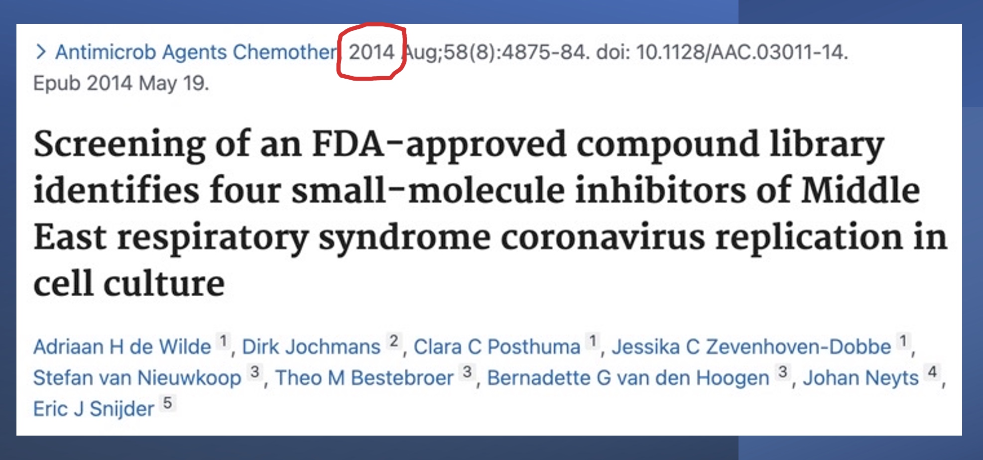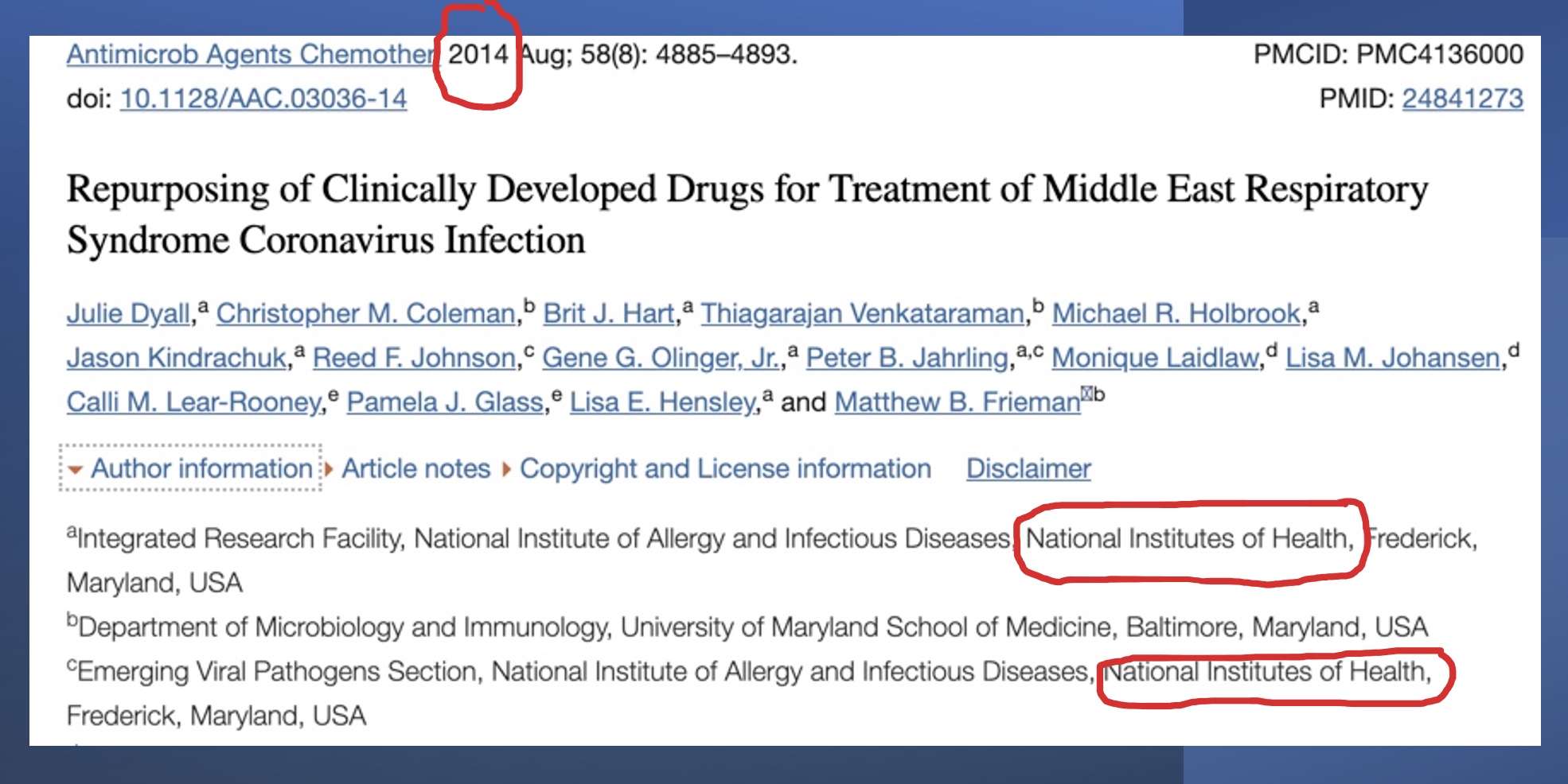 The very next article in the same journal came from Tony Fauci’s NIAID, which has a branch adjacent to or inside of Fort Detrick, and the authors included several old Fort Detrick scientists. These NIH scientists found that 66 drugs had efficacy against MERS and/or SARS-1, and the 66 drugs included chloroquine (CQ) and its cousin hydroxychloroquine (HCQ), which worked against both viruses.