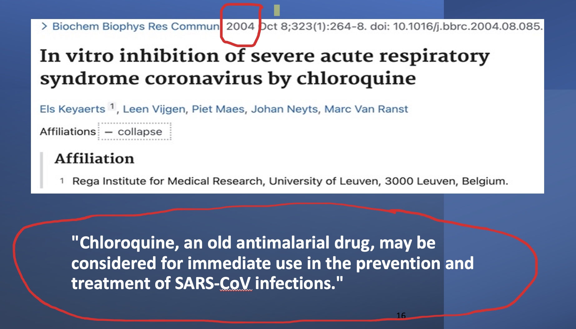 After SARS-1 occurred in 2002-2003, many nations’ scientists tried to find remedies for it. These Belgian scientists showed that the chloroquine drugs worked against SARS-1 in 2004, and recommended it for both prophylaxis (where it could potentially supercede the need for a vaccine) and treatment of SARS-1.