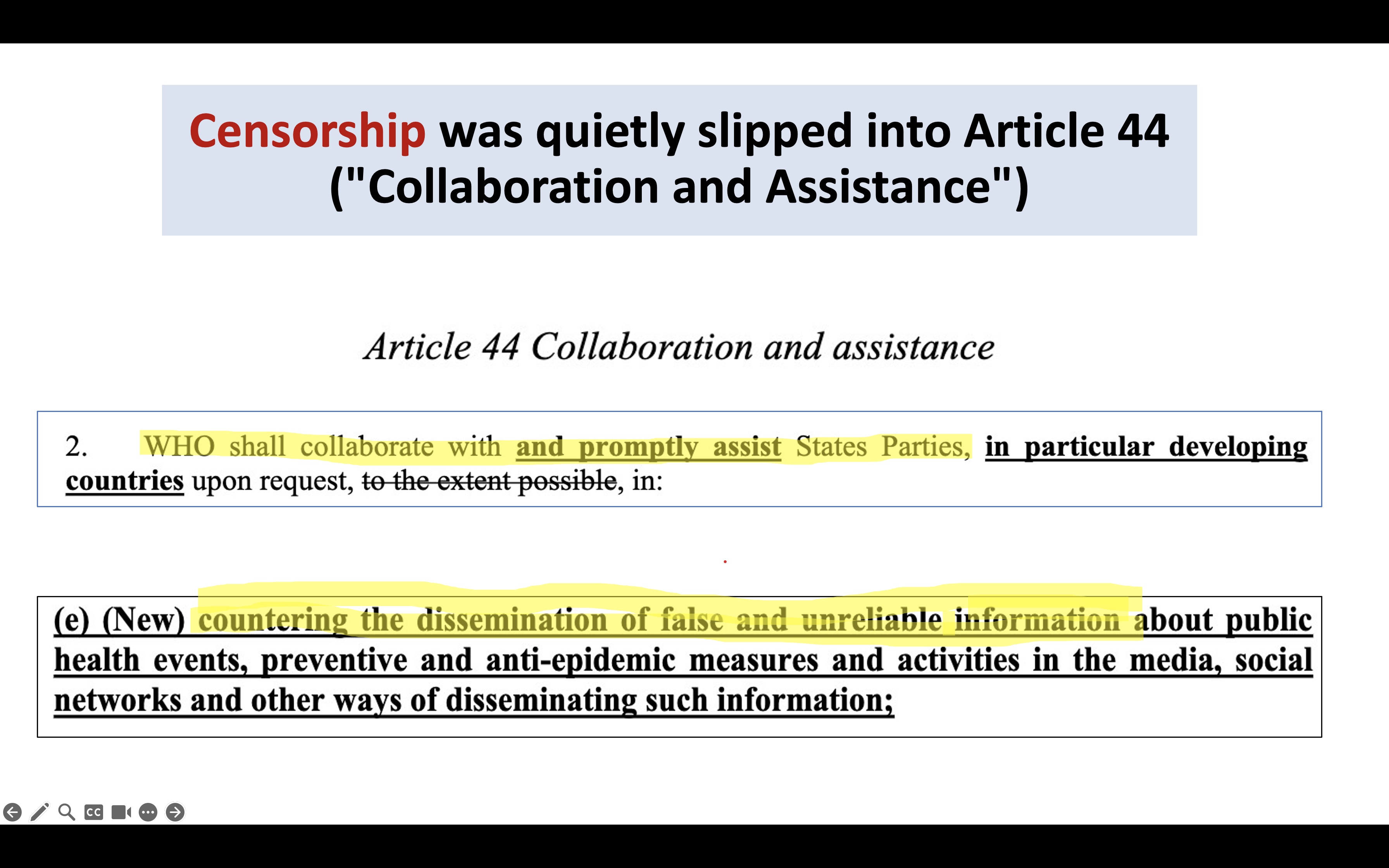 They are committed. And they are very sneaky. Read this, a nugget from the IHR, the same proposed document I started with. Censorship was rolled into the section on how the WHO can assist nations. Assist them in breaking international and probably domestic law. The bolded parts are the new proposals.