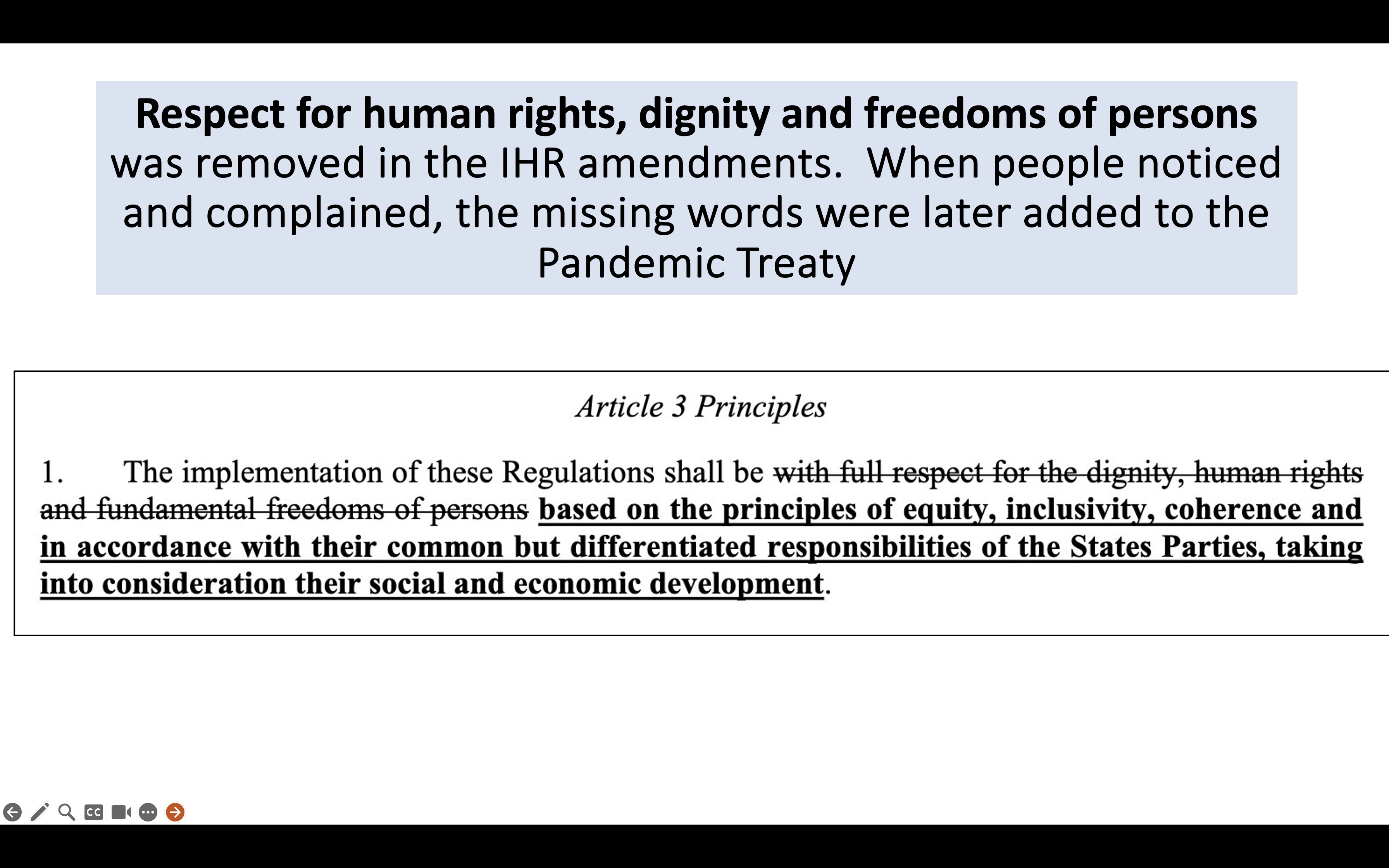 I hope you saw that “With full respect for dignity, human rights and freedom of persons” which are embedded in the current International Health Regulations (IHR) was crossed out in the draft of the IHR amendments prepared by the WHO’s review committee and working group a year ago. All negotiated text since then has been kept under the highest secrecy. So we only have the draft from last February to go on, in trying to understand what the current version of the document might be. Human rights, dignity and freedom of person were to be excluded. See screenshots below.