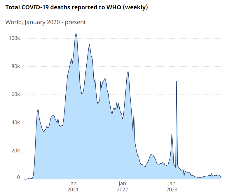 However, if we accept Covid-19 (for sake of argument) as a natural event, then it should obviously be included when determining risk. There are meaningful debates about the accuracy of how deaths were recorded and attributed to Covid-19, yet assuming the WHO is correct in its estimates, then the WHO records 7,010,568 deaths attributed to (or associated with) the SARS-CoV-2 virus over 4 years, with most in the first 2 years (Figure 2).