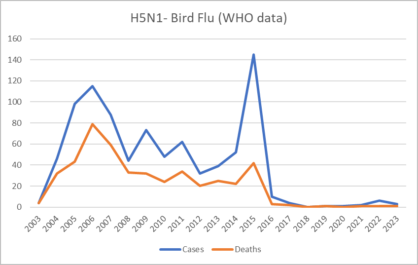 Thus, Metabiota’s claim of an increase from 1 to 10 spillover events per year from 1995 to 2000 seems unlikely to refer to a real change in seasonal influenza. It is possible that the increase refers to advances in detection. What is more, if only less severe common influenza variants are considered such as highly pathogenic avian influenza (HPAI) types H5 and H7, then mortality has greatly declined over the past century (see graphic from Our World in Data site). The WHO equally notes that mortality from ‘Bird Flu,’ of which we most frequently hear, has been declining (Figure 6).