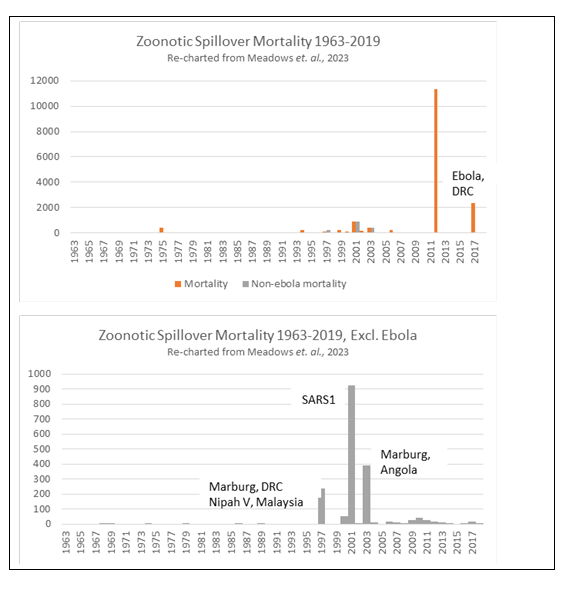 In order to address an apparent oversight in the Annex D table, we also included the 2018 and 2018-2020 Ebola outbreaks in the Democratic Republic of Congo in our analysis, since there were no large outbreaks of Ebola reported in 2017. This is likely what “Ebola 2017” was intended to denote in the Annex D table. In our analysis (Figure 1) we exclude Covid-19 since its associated mortality remains unclear and its origin (laboratory-modified or natural) is contested, as discussed later.