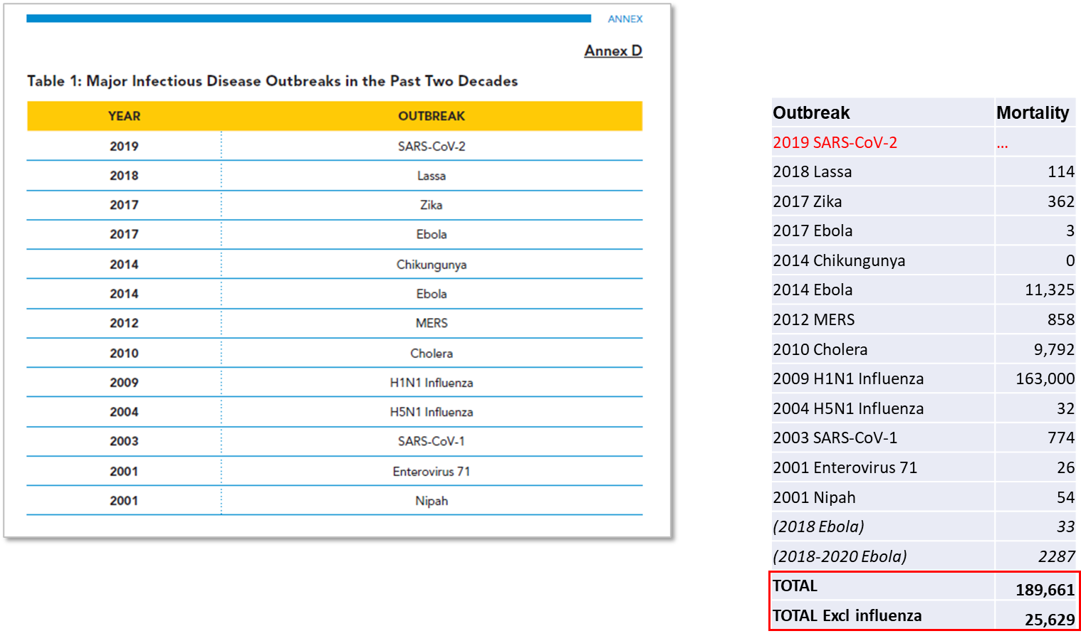 “The last two decades have seen major global outbreaks of infectious diseases every four to five years, including SARS, H1N1, MERS and Covid-19. (See Annex D.)”