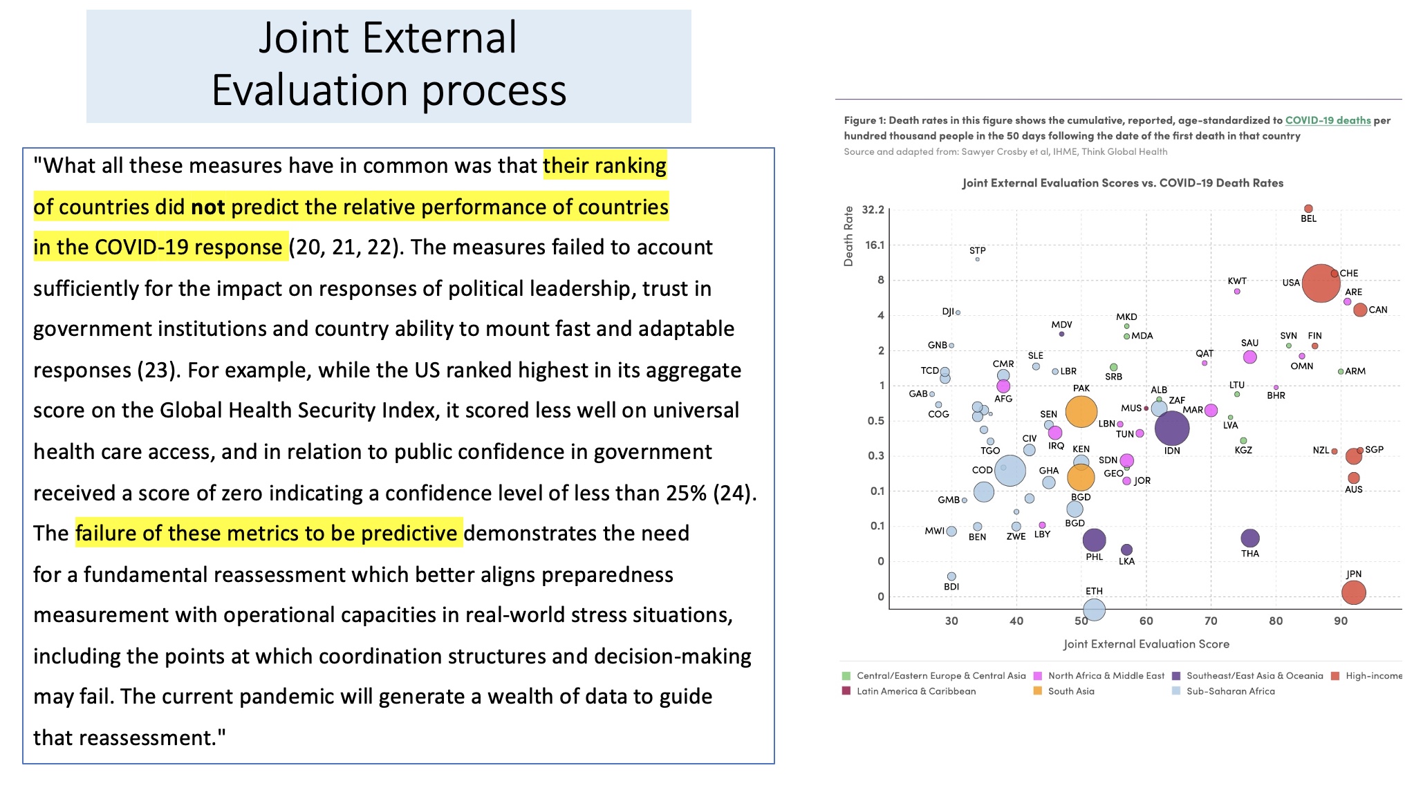 And here is what they were forced to write and the graph they could not suppress. Please expand it so you can appreciate what it shows. It graphs death rates (on a log scale to make the extremely high death rates in developed countries appear lower relative to those in less developed countries) against how well each country scored on the CDC’s favorite measure of pandemic preparedness, termed the Joint External Evaluation or JEE. It shows that the better prepared a nation was (the higher they scored on the JEE) the higher was their death rate. And the correlation was tight and highly reliable.