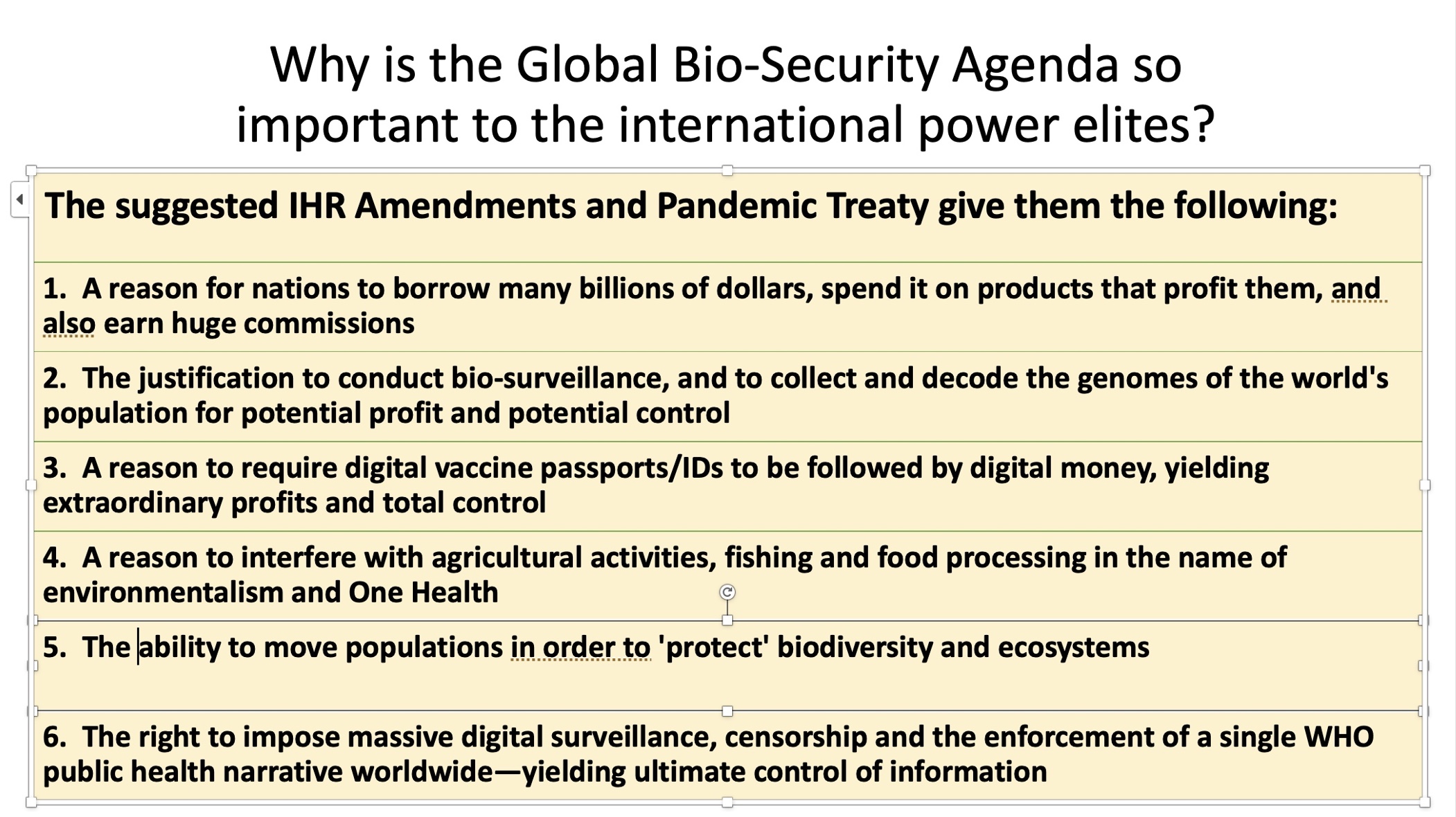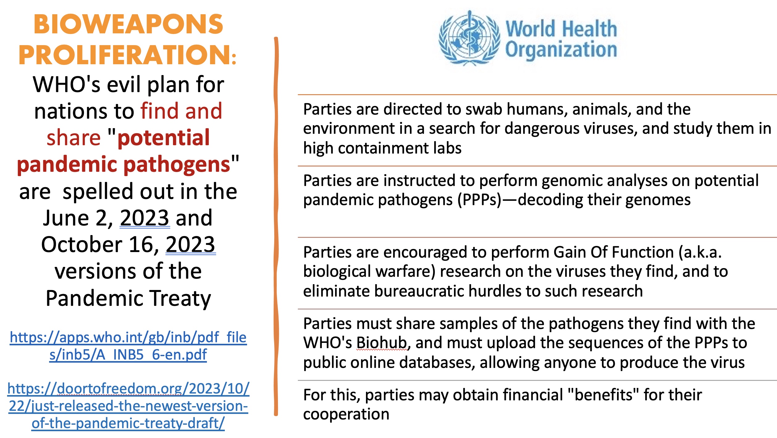 But in fact the scheme proposed by the WHO would institutionalize and fund the creation of new lab-borne biowarfare agents that could be released (or leak) to cause future pandemics, as well as support and fund a massive new surveillance and control apparatus.