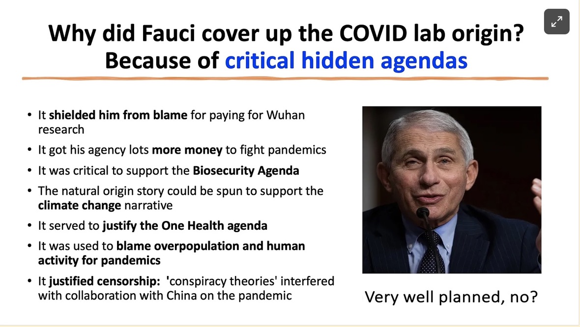 I have explained my analysis for why the zoonotic theory of origin was absolutely critical for the world takeover scheme that was to succeed it. I hope these little power-point slides I made will make it very clear: