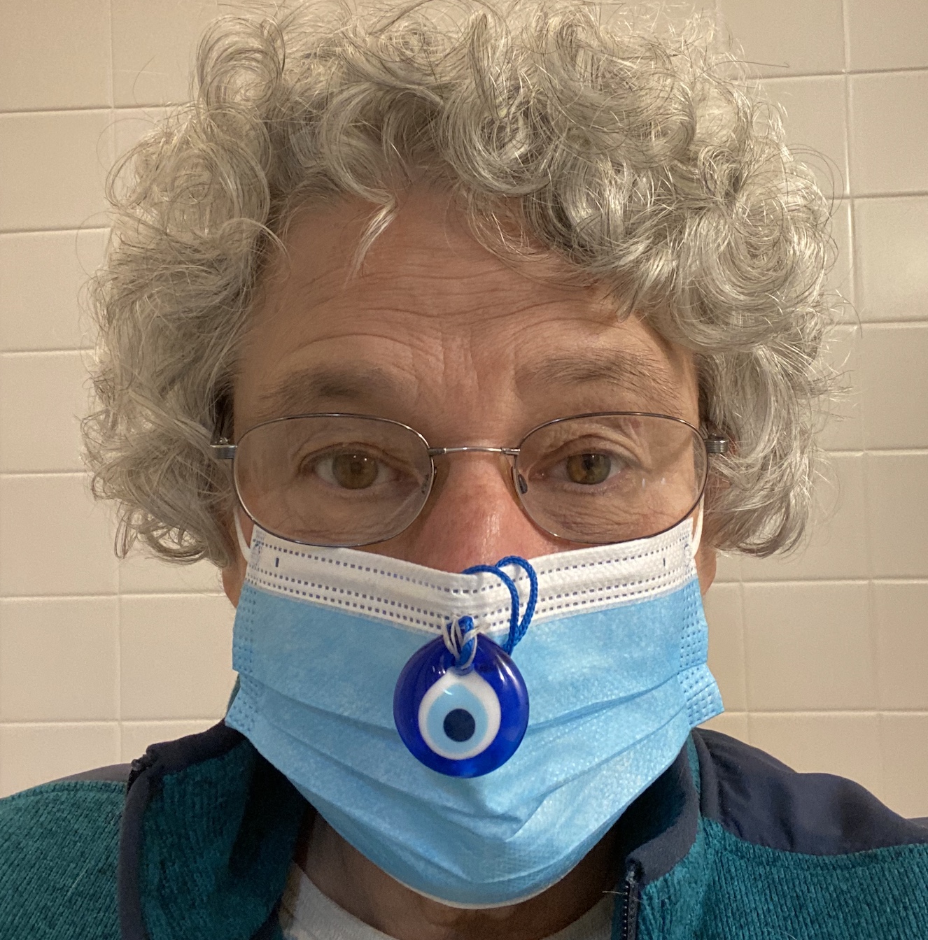 Another way to impinge on freedom of speech is to make speech barely intelligible. I tried several ways to tell a story when I was forced to wear a mask, but I don’t know how many people grasped my meaning. In this case, I sewed an “evil eye”talisman to my mask, trying to indicate that the mask was simply another talisman, trying to ward off the evil COVID through magic.