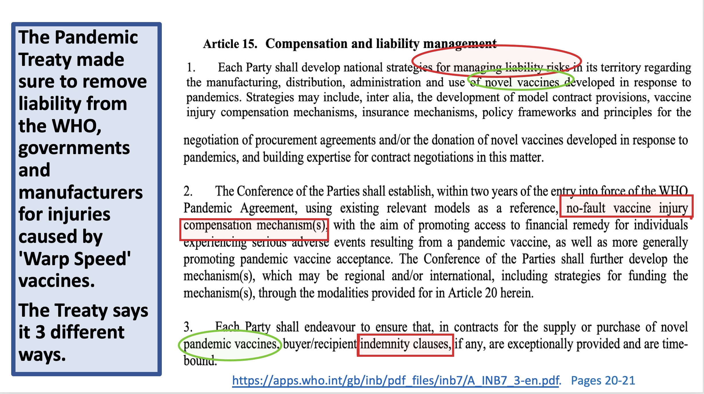 The “NO LIABILITY” aspect of the unlicensed, novel vaccine developed in 100 days is in-your-face in the WHO’s proposed treaty