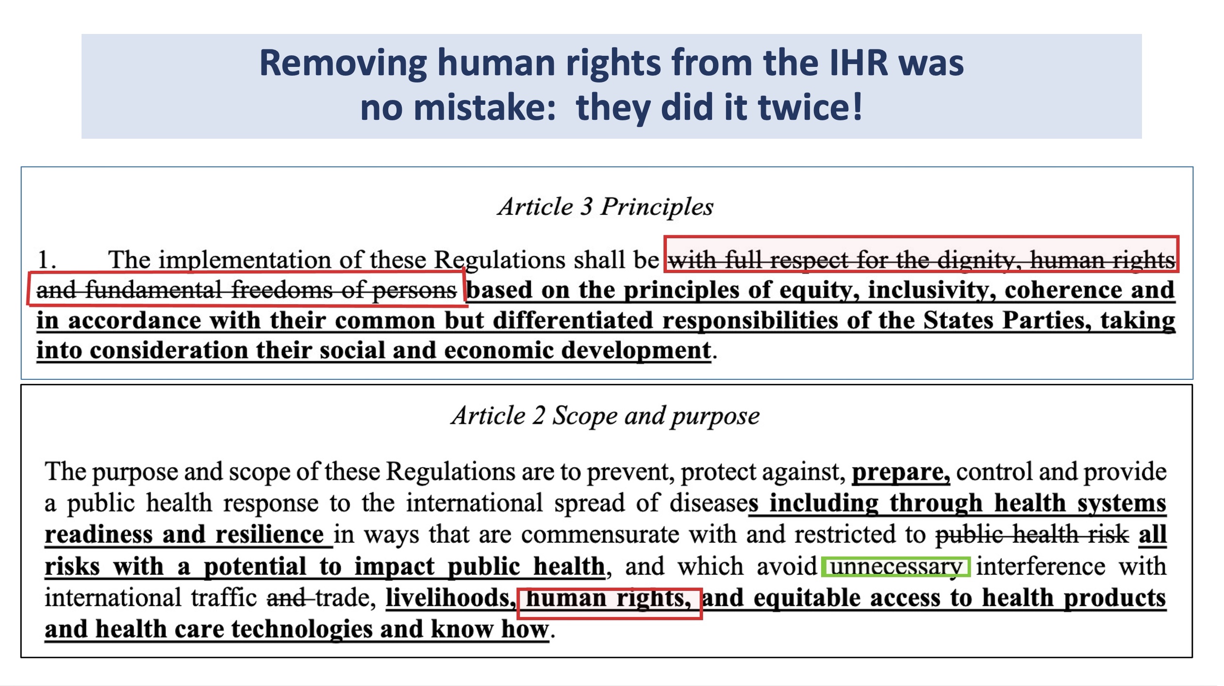When they wrote the IHR amendments, crossing out human rights was no mistake. ‘Cause they did it twice. The second time human rights were only to be ignored when NECESSARY.