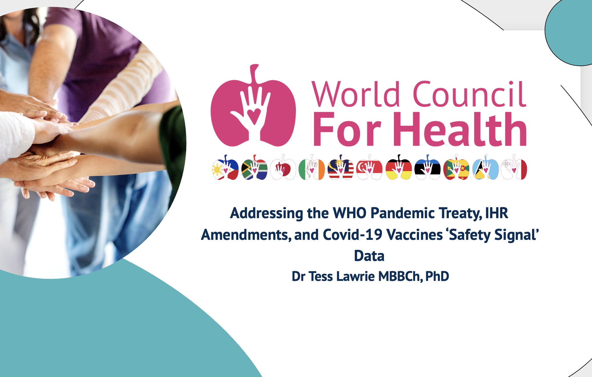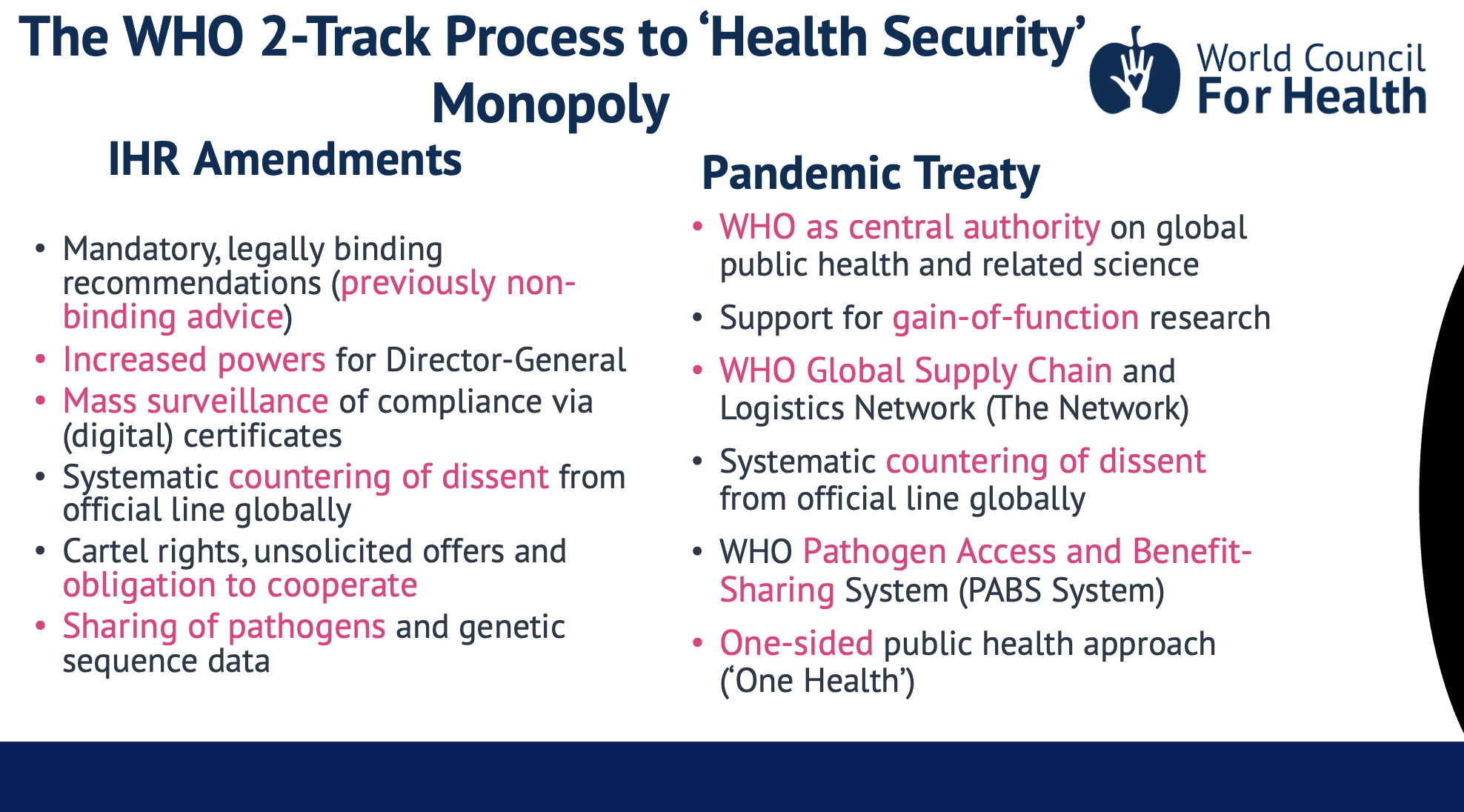Whilst the IHR and Pandemic Treaty are complementary documents, we are most concerned about the proposed IHR amendments at this stage. As you have heard from other speakers, the IHR is a legally binding document, amendments to which may be adopted through a simple majority vote by unelected representatives at the World Health Assembly this May.