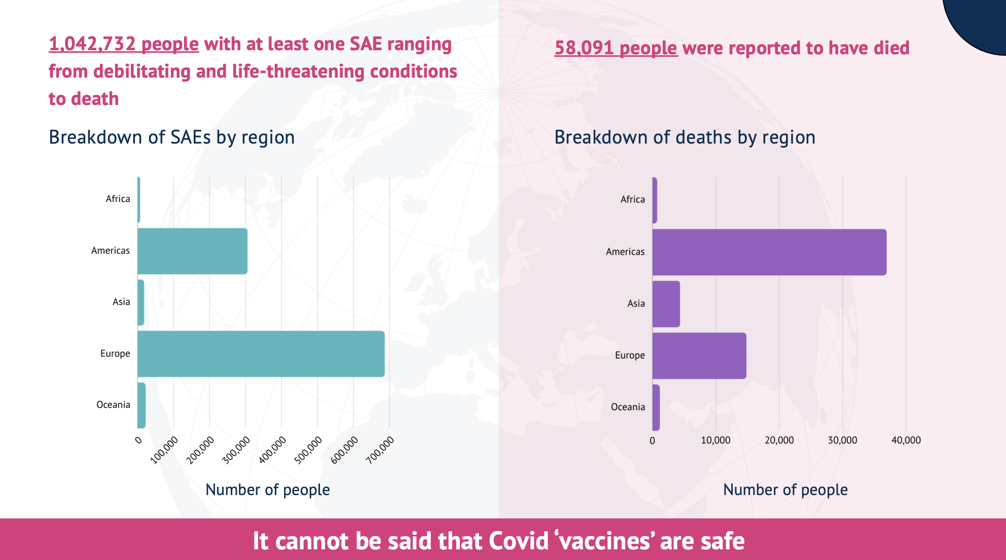 Approximately 70% of cases were reported by professionals. The majority of vaccine harms data were derived from Europe and America, with Europe accounting for approximately 700,000 cases of serious adverse events and 15,000 reported deaths. Sixty-four percent of reports of death after vaccination, equivalent to approximately 37,000 people, were from the American continent. The majority of serious adverse events occurred for the 18 to 64 year age groups, and the majority of deaths reports were for the over 65 year age groups.