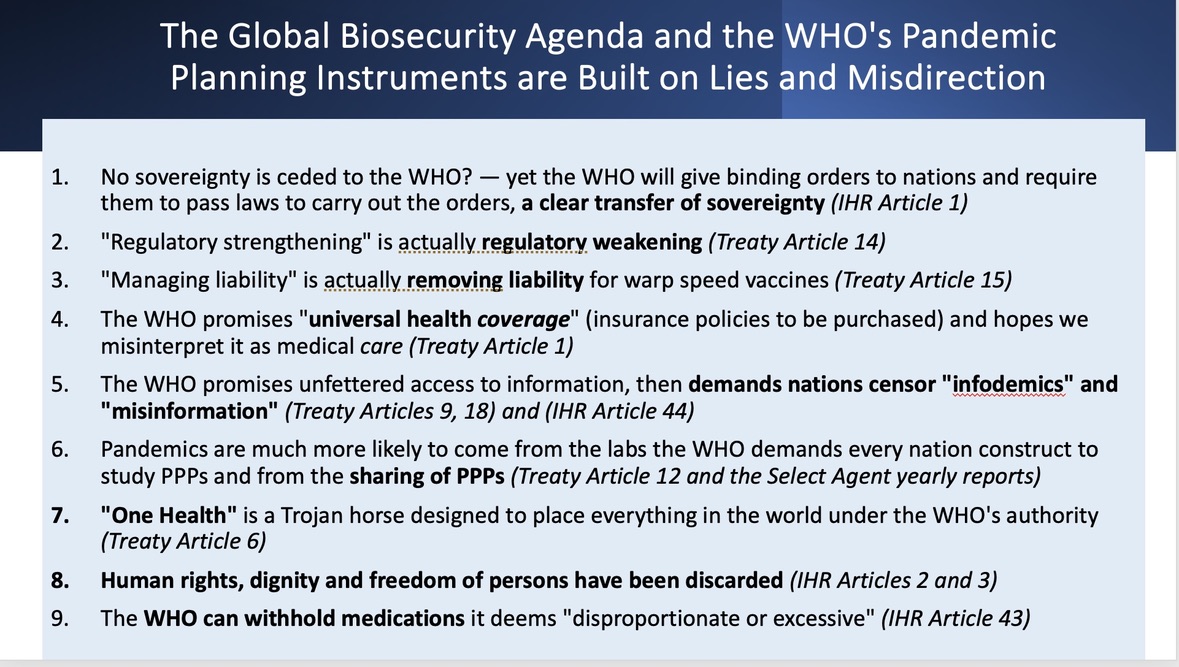 If this was only about a trade agreement, why is everyone talking about the loss of sovereignty, the imposition of global censorship, and global governance being brought in under the guise of “pandemic preparedness”? Because those are the real issues. Don’t let yourself be fooled that this is merely a trade disagreement.