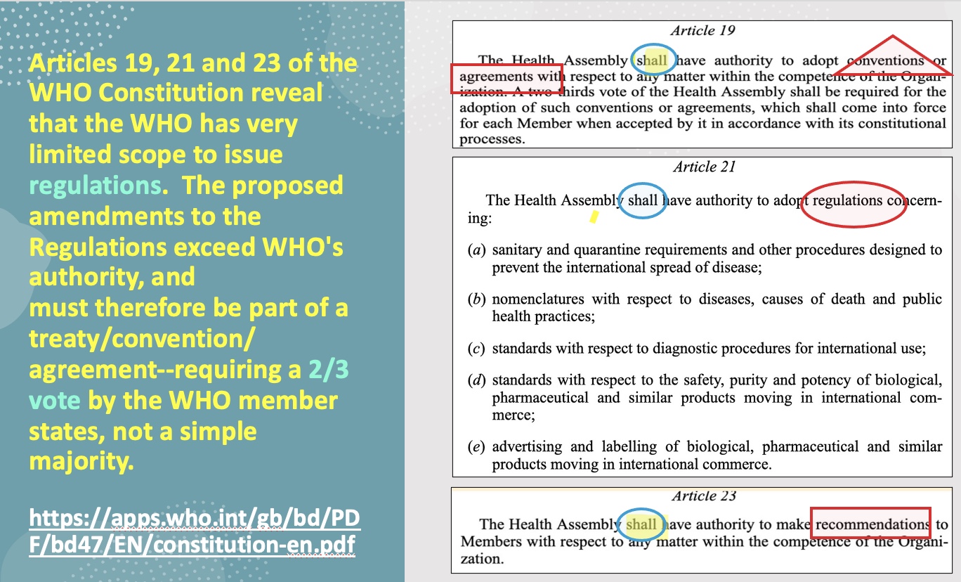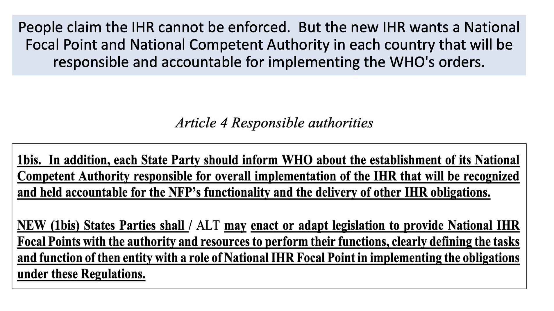 The WHO lawyers are trying to play us, saying the nations are sovereign because they still make the laws. What the WHO omits saying is that under the Treaty and proposed IHR Amendments, nations will be forced to pass the laws that the WHO tells them to pass. Examples of this and other word games below.