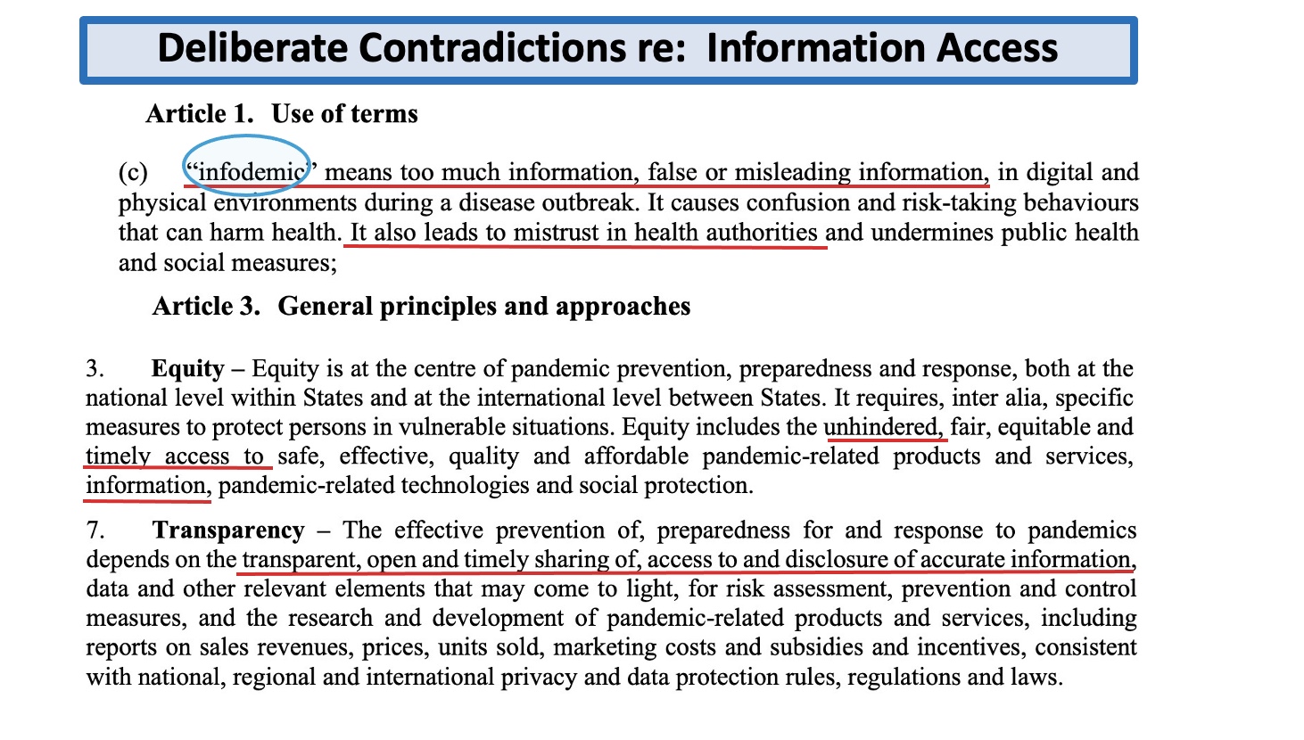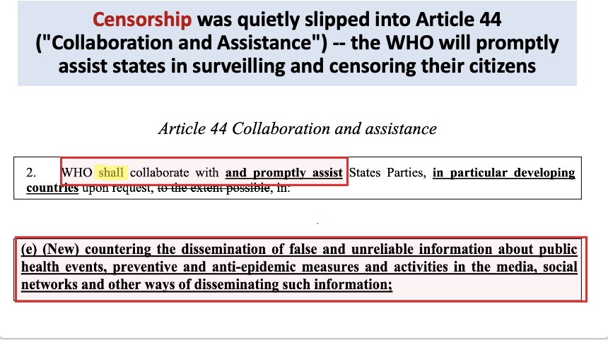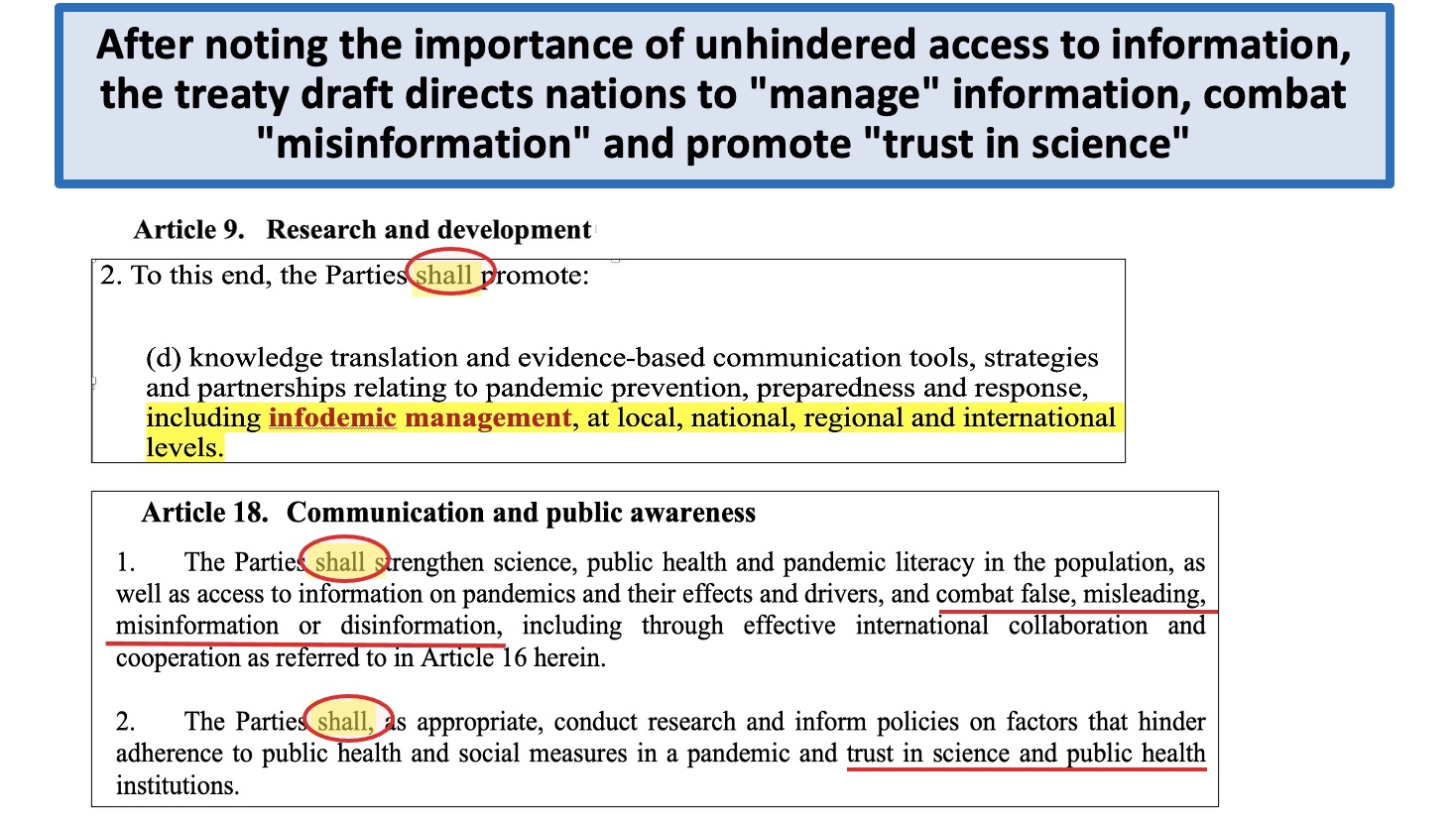 Then a few pages later the treaty demands that nations perform “infodemic management”—which requires not only censorship, but also surveillance of everyone’s social media footprint, so the nation will know who and what to censor. This violates both the First and Fourth Amendments to the US Constitution.