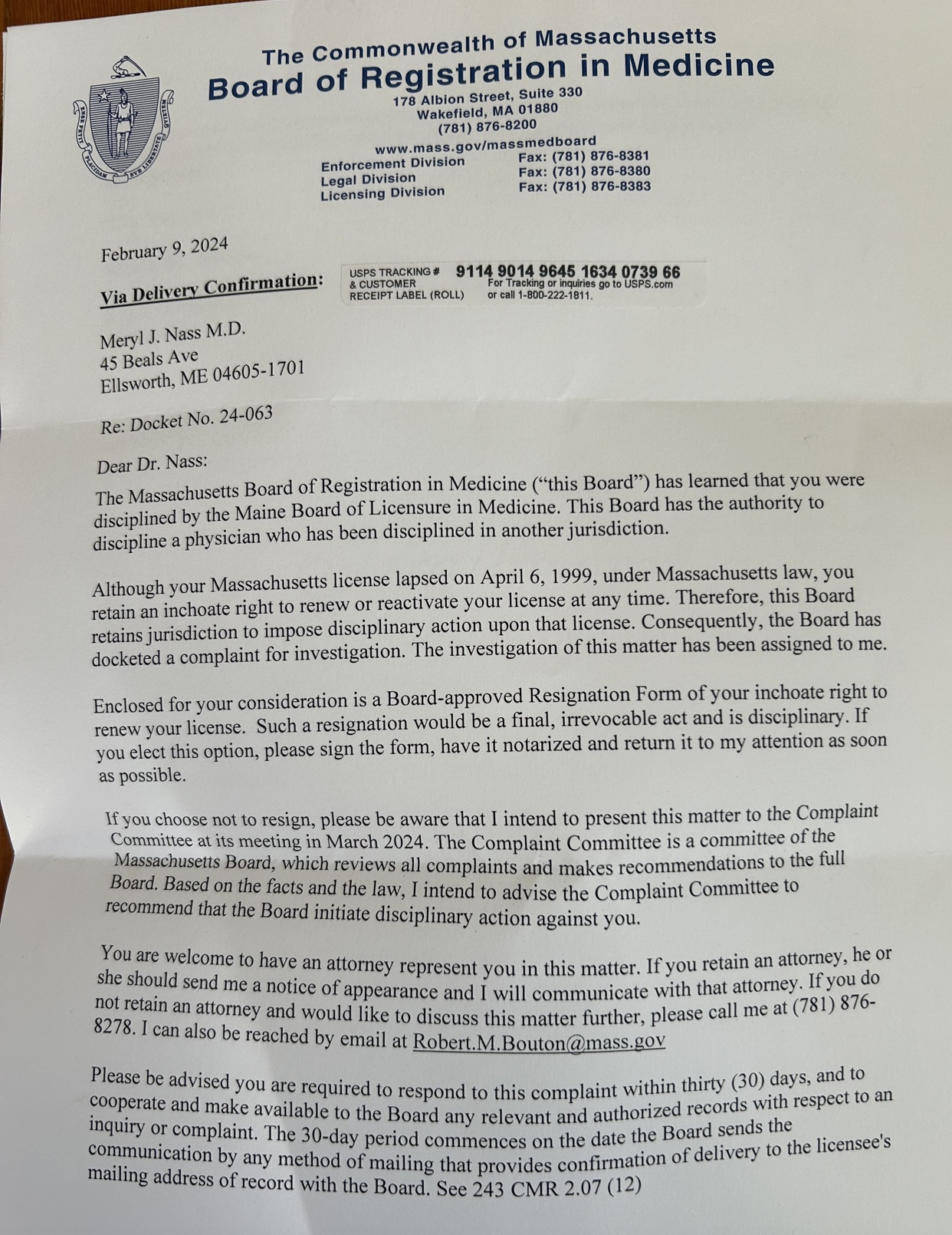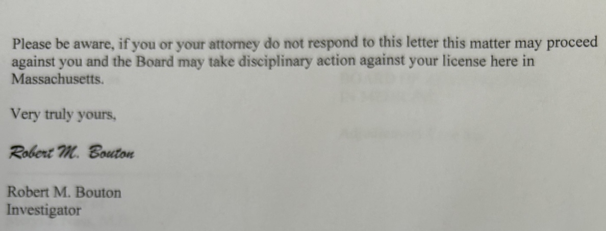 Do you think Massachusetts will ask for a payment? Is this going to be the equivalent of the new government crime of asset seizure, just because you happened to be in your car with an asset? Just because I had a Massachusetts license once? Or do they just want to run up my legal bills? Do the Board members really have so much time on their hands that they want to punish a nonresident (for 27 years), unlicensed doctor?