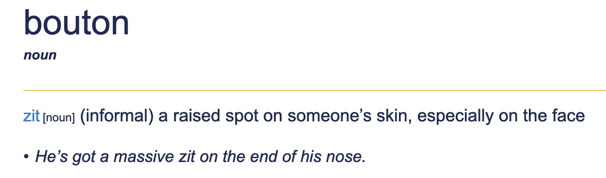 It seems there are no coincidences. The universe has an impeccable sense of humor. The part-time ER doctor who was the Maine Board’s expert witness against me was named Dr. Faust. I wondered what the French word “bouton” meant, and the answer was very surprising. Hard to believe. But the Cambridge dictionary insists it is so. It means “zit” in French. If I had a name like that, I’d be a mean son of a gun too.