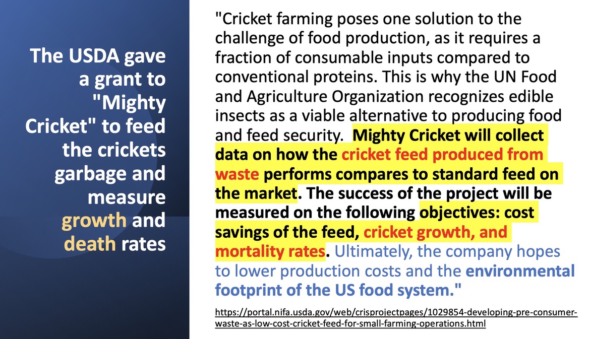 Why did they pick bugs for us to eat? It’s becoming clearer. The bugs will be fed garbage and if the crickets don’t die from it, we will be fed the crickets.