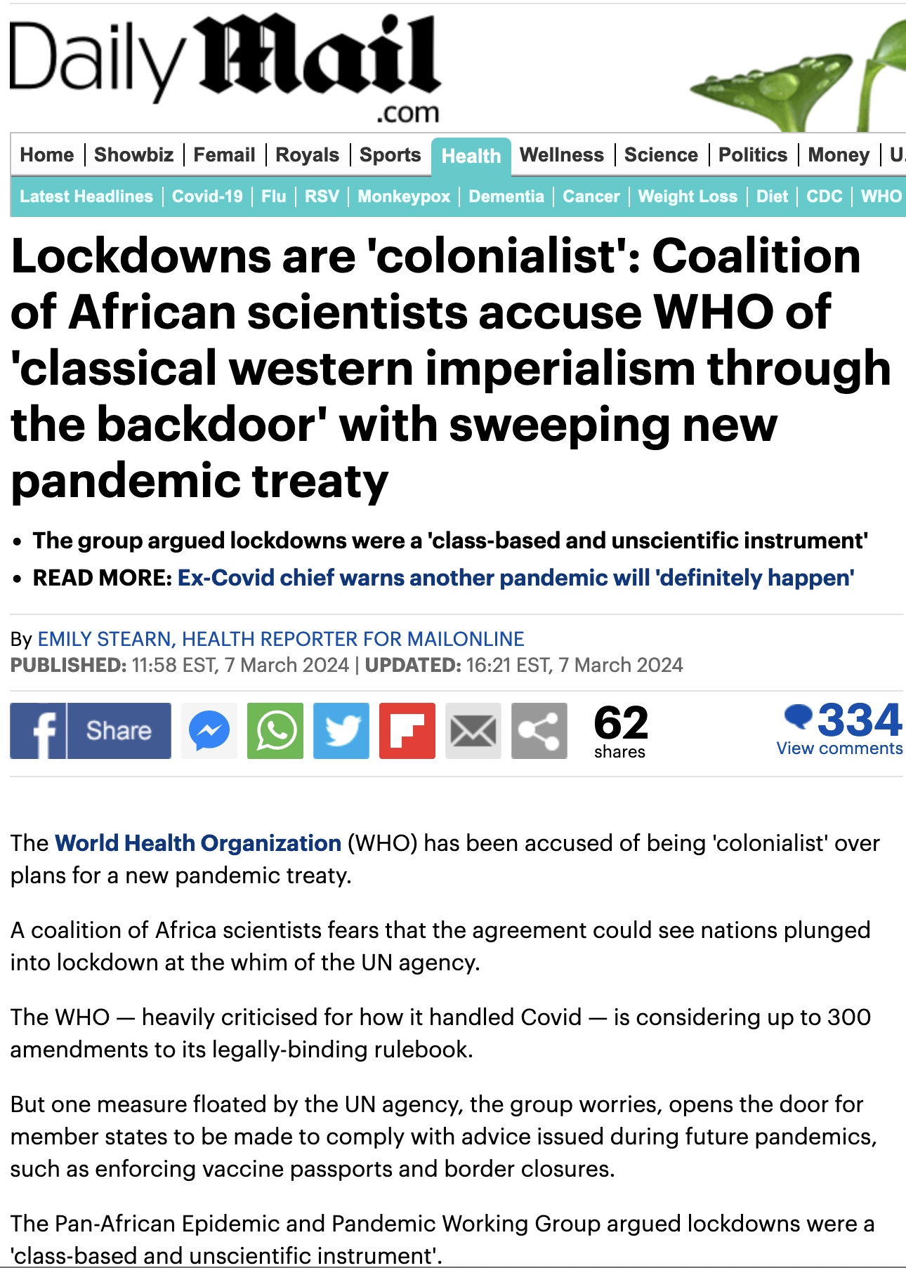 Africans realize they are being frogmarched into a new brand of colonialism by the WHO–and more are saying no, why should they be subjugated to Geneva? (Is this why Tedros was plunked there?)