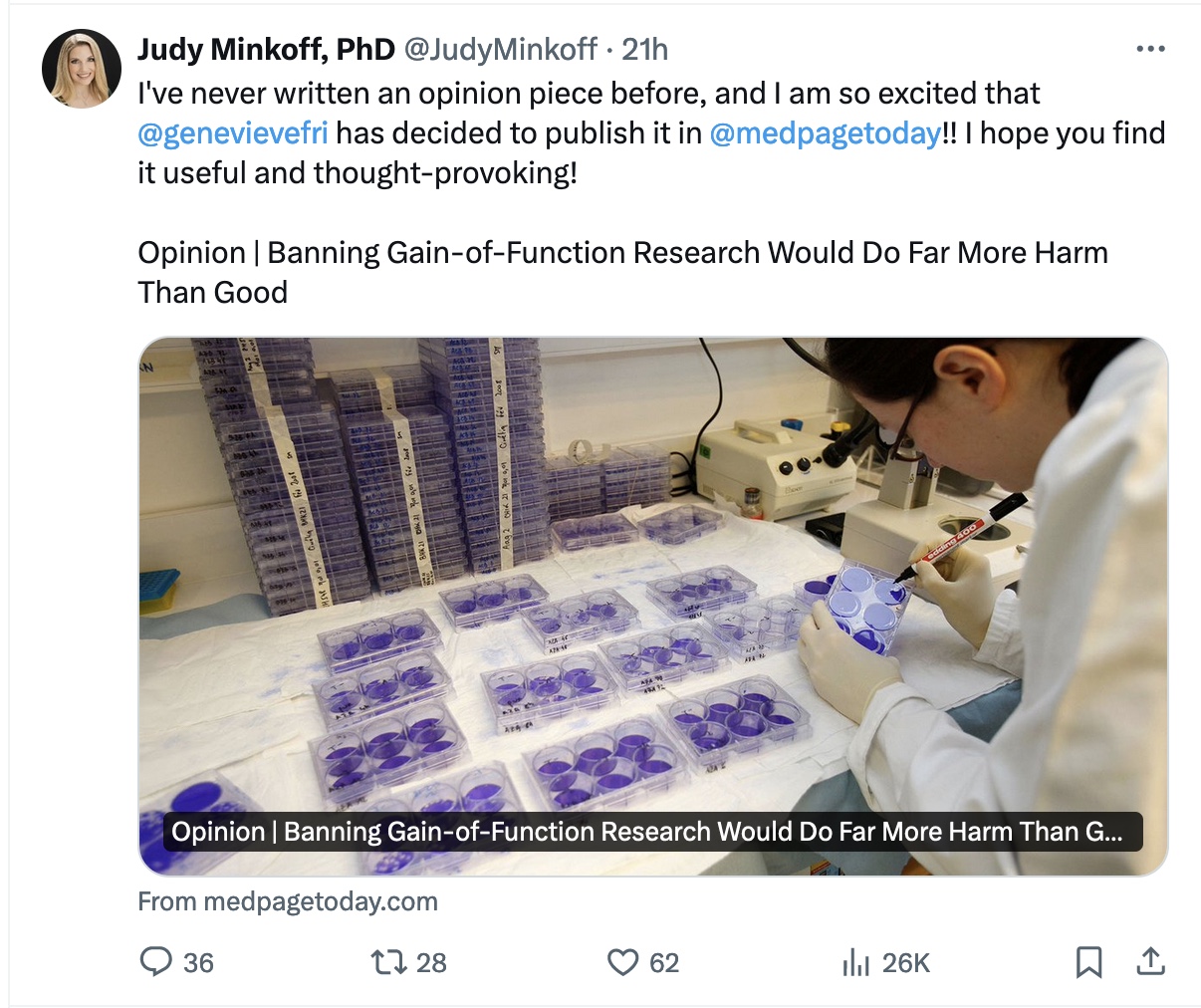 Judy Minkoff, PhD, is a virologist and science communicator in the Department of Microbiology at New York University Langone Health in New York City.