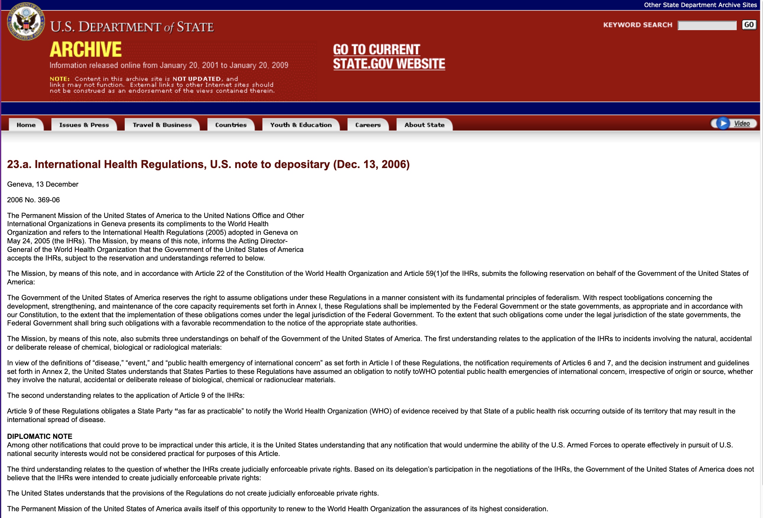 23.a. International Health Regulations, U.S. note to depositary (Dec. 13, 2006)