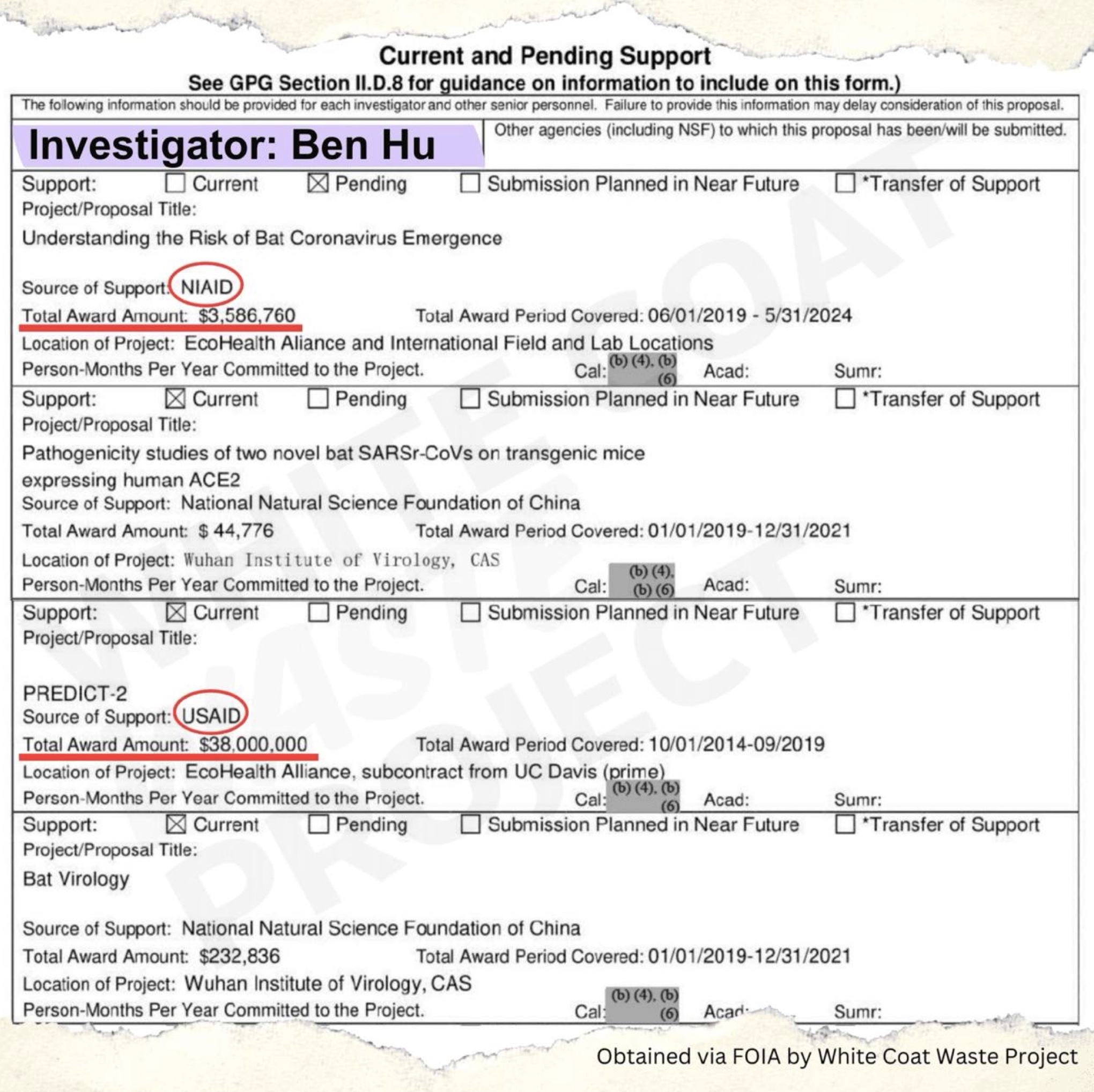 Ben Hu got $38 million bucks from your agency, USAID, laundered through the EcoHealth Alliance, according to contract Info revealed in a FOIA lawsuit prosecuted by the White Coat Waste project. And over $6.5 million from NIAID. And wait—his NIAID contract is still active, ending 5/31/24.