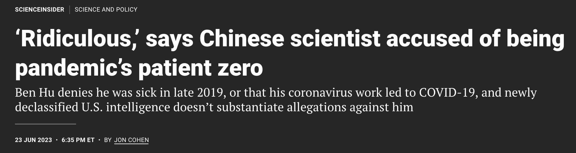 Now, Jon Cohen at Science magazine says that asserting that Ben Hu could have been Patient Zero is ridiculous. The only problem with that is that Jon Cohen is a USG mouthpiece who squeals on his sources and is used to beat down real leads in the COVID origins puzzle. So the fact that Jon was engaged to write this story actually gives the claim more credence, rather than less.