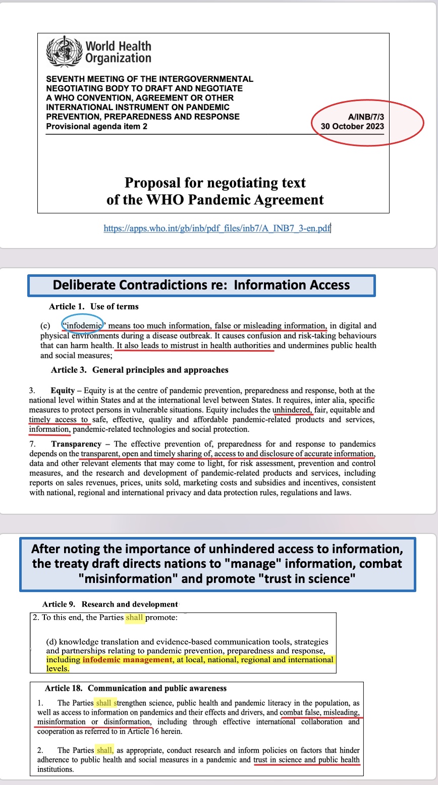 Now we move to screenshots from different versions of the Pandemic Treaty, which has had many names, but has been called the Pandemic Agreement since last October 2023. You can see that while the treaty claims to support unhindered access to information, a few pages later it demands that nations manage “infodemics” and censor misinformation and disinformation. This is typical of drafts of the treaty: it says one thing in one place and then elsewhere maintains the opposite, allowing politicians to claim the treaty asserts it does not grab any sovereignty, when it clearly does exactly that.