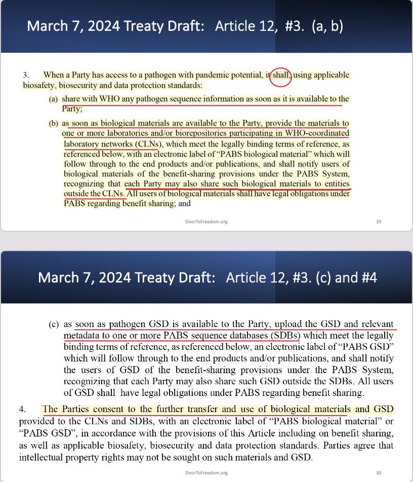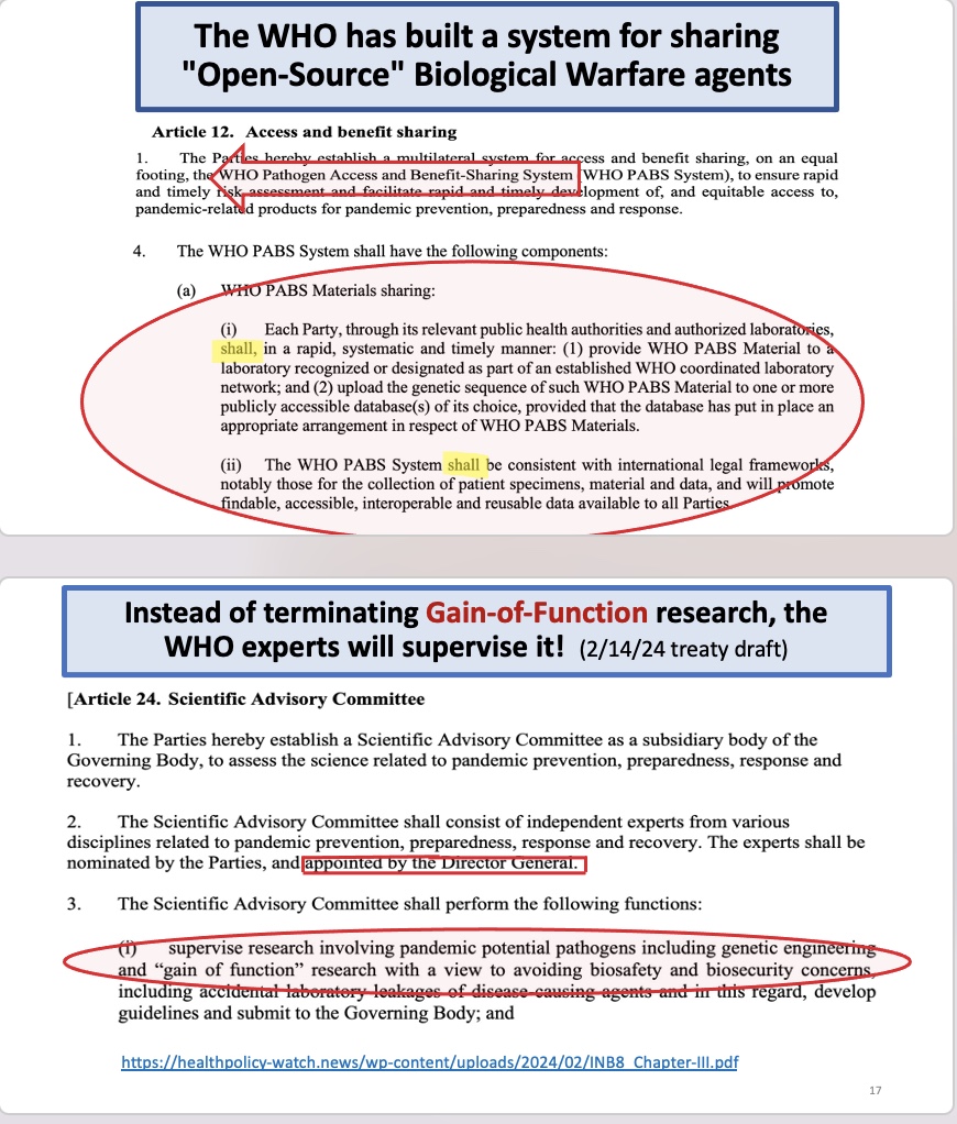 The IHR amendments as well as the Pandemic Treaty specify that “potential pandemic pathogens” [both their sequences and actual specimens] are to be shared with the WHO and then shared globally, with the only proviso here being that WHO will not share them with “conflict and violence elements” once notified not to by a state party.