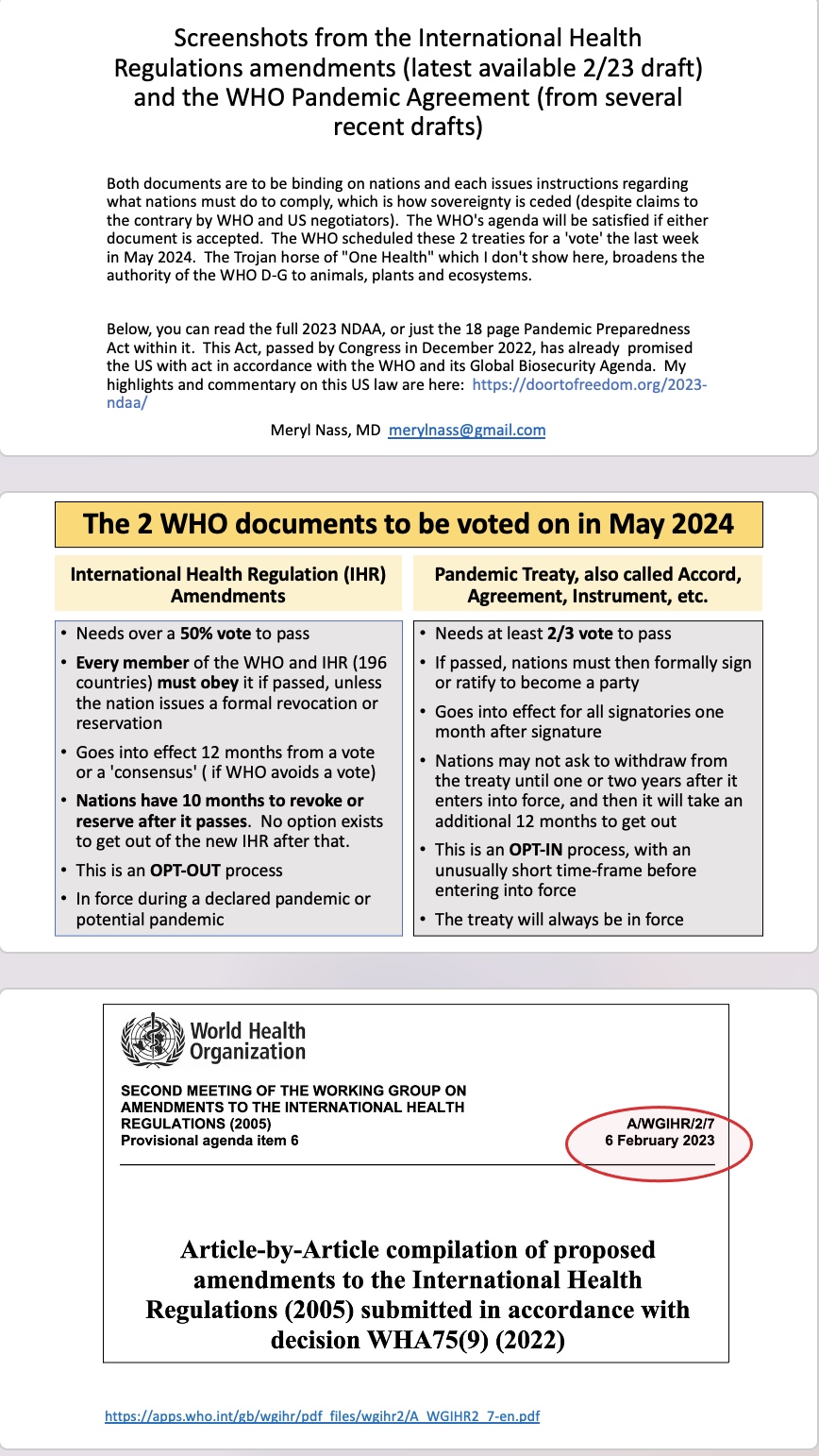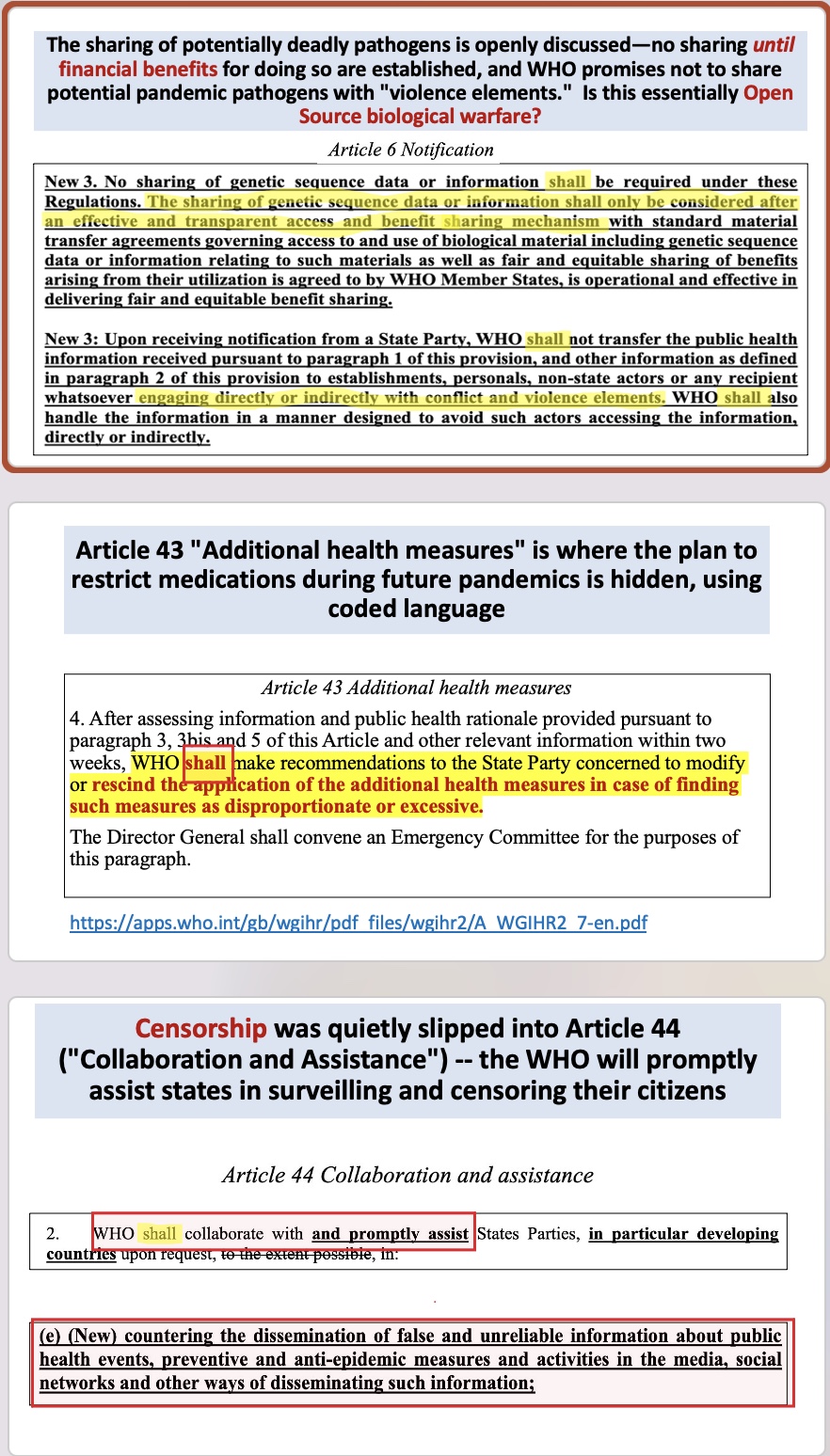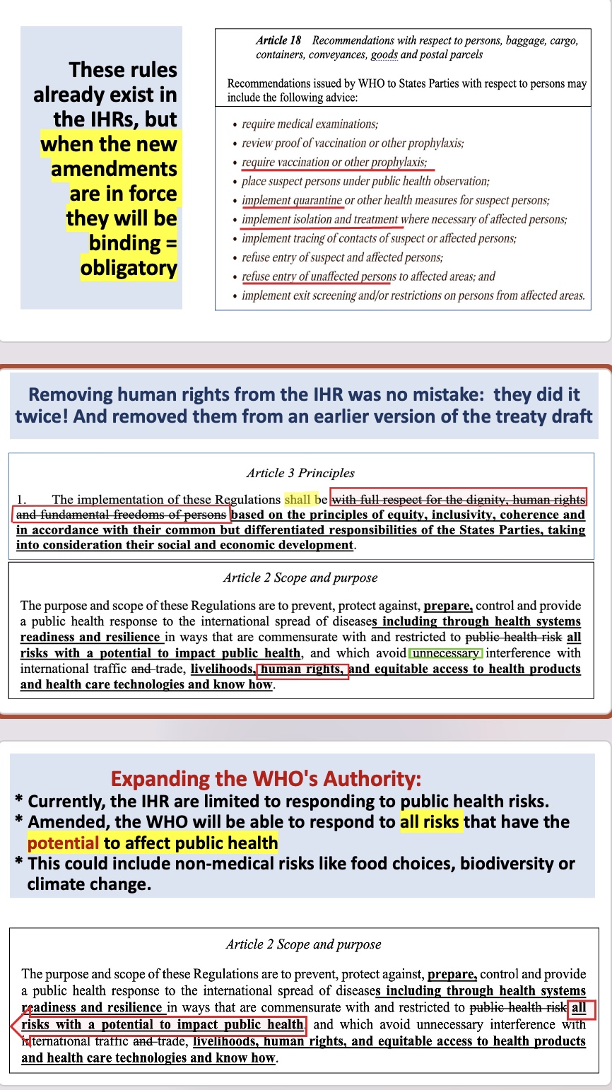 I start out with the International Health Regulations (IHR) amendments. We don’t have an official version later than February 2023, so we don’t know exactly what will be voted on next month, but this is what the public has been shown. Everything inside a thin border with white background is verbatim from the proposed IHR Amendments.