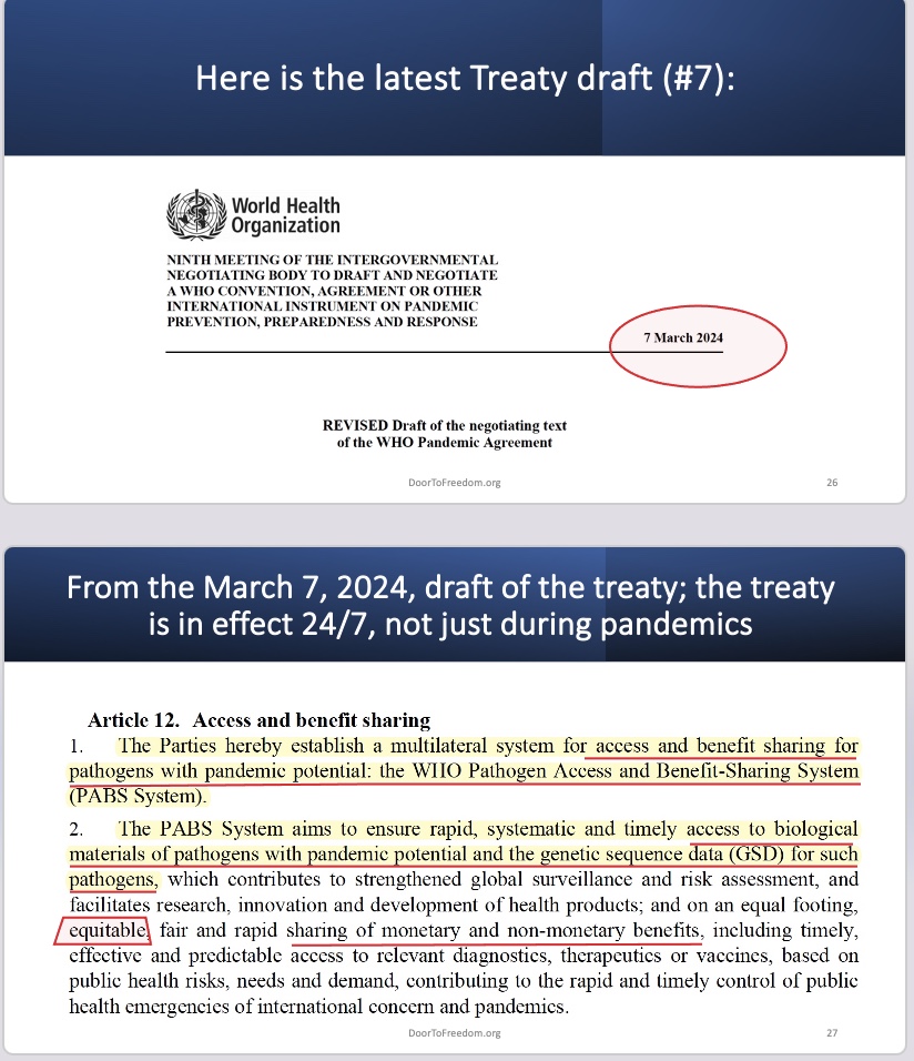Below is from the March 7, 2024 Treaty draft. The treaty is in effect 24/7, which means that the required sharing of pathogens is to occur regardless of whether there is a pandemic or potential pandemic. It is not restricted to a response to a public health threat. It is an activity that is to occur year round, and nations are encouraged to find potential pandemic pathogens for which they can be rewarded monetarily. Wide sharing, beyond the WHO’s lab network, by the WHO and the party that found the pathogen is encouraged.