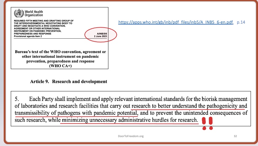 The screenshot below is from a version of the treaty that was issued in June 2023. At that time the draft coyly does not use the terminology “gain of function” but instead defines it, using the coded language “research to better understand the pathogenicity and transmissibility of pathogens with pandemic potential” to describe it. What Article 9, paragraph 5 really says is that if you are performing Gain of Function research, then “minimiz[e] unnecessary administrative hurdles for [that] research.” In other words, loosen the strictures, and thereby enable more lab accidents/spills/leaks to occur.