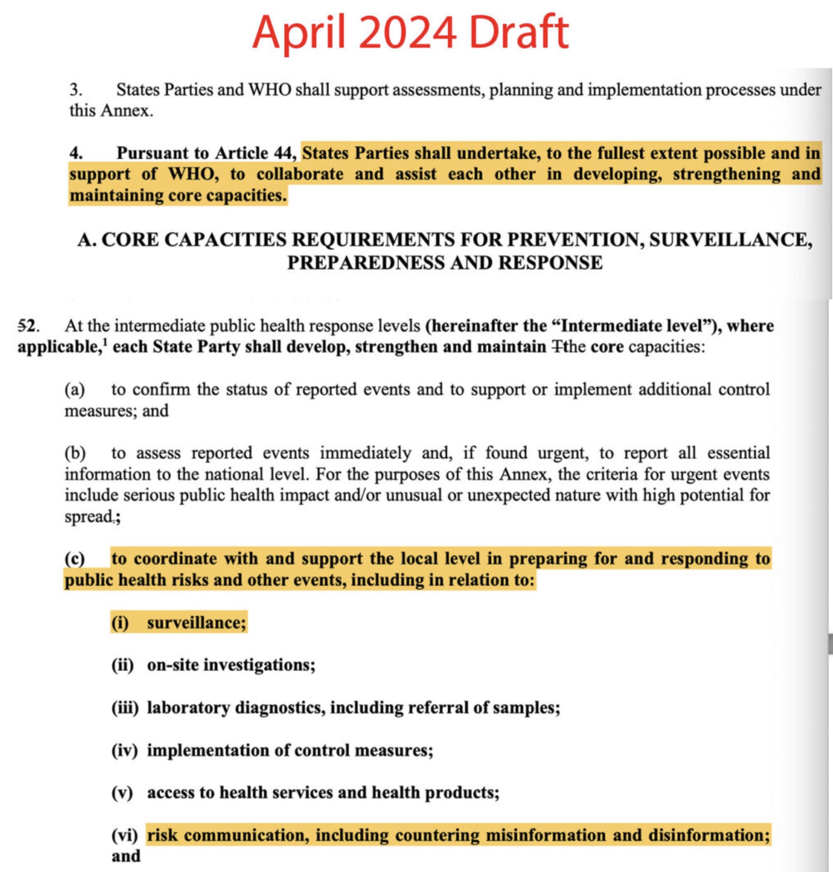 The control of misinformation and disinformation got moved to an Annex where it would be less obvious. However, the control of information is now even more stringent, as “surveillance” and managing misinformation are now considered “Core Capacities” that all nations will have to develop, and on which they will be scored using a monitoring system still to be developed.