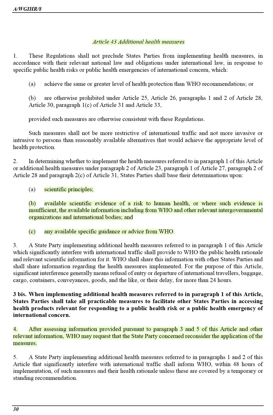 Article 43 is where the WHO gave itself the right to withhold medicines or other measures, and I fear that although the language has changed, they are trying to do the same again: