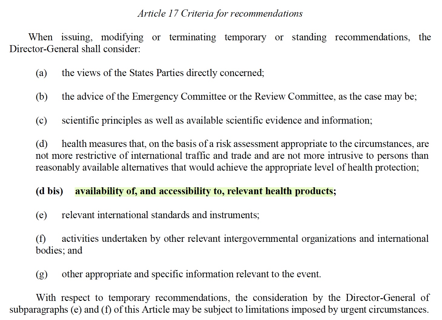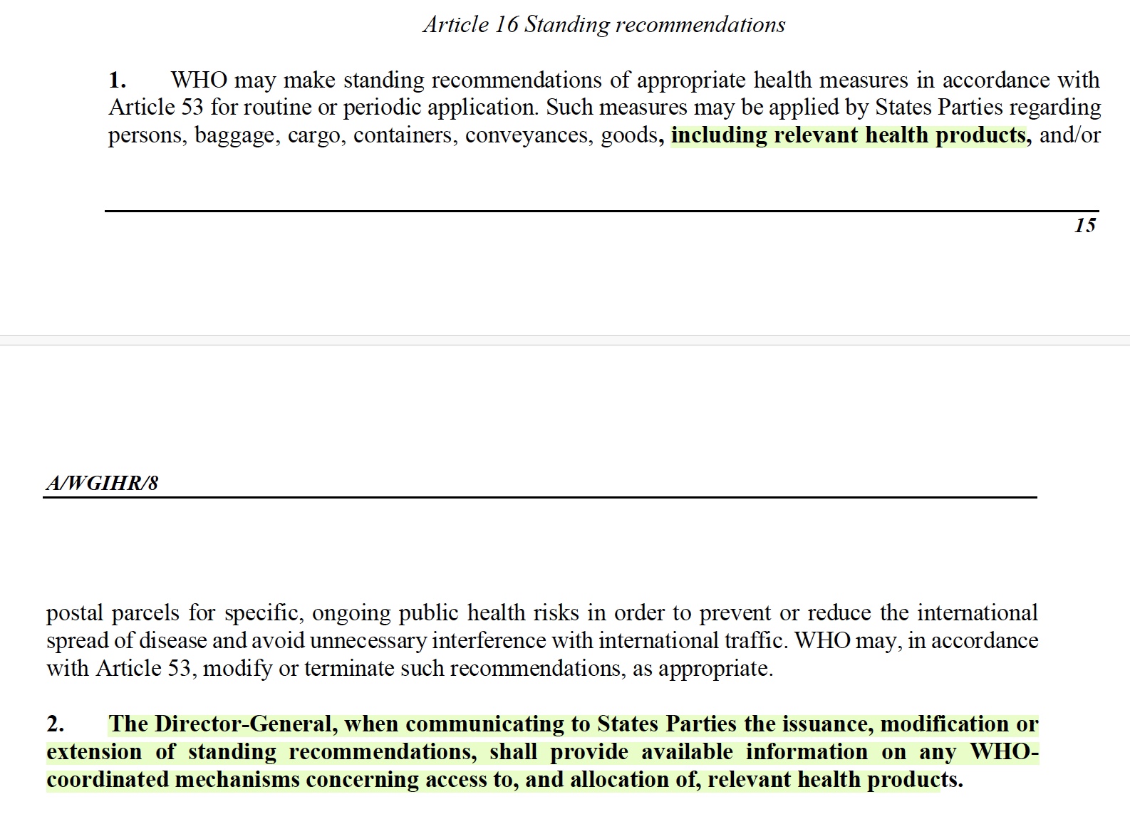 Will the WHO give itself the right to prevent nations using certain drugs, as in the lasst iteration of the IHRs? The wording is so ambiguous that I don’t know, but I fear it is a distinct possibility. See below: