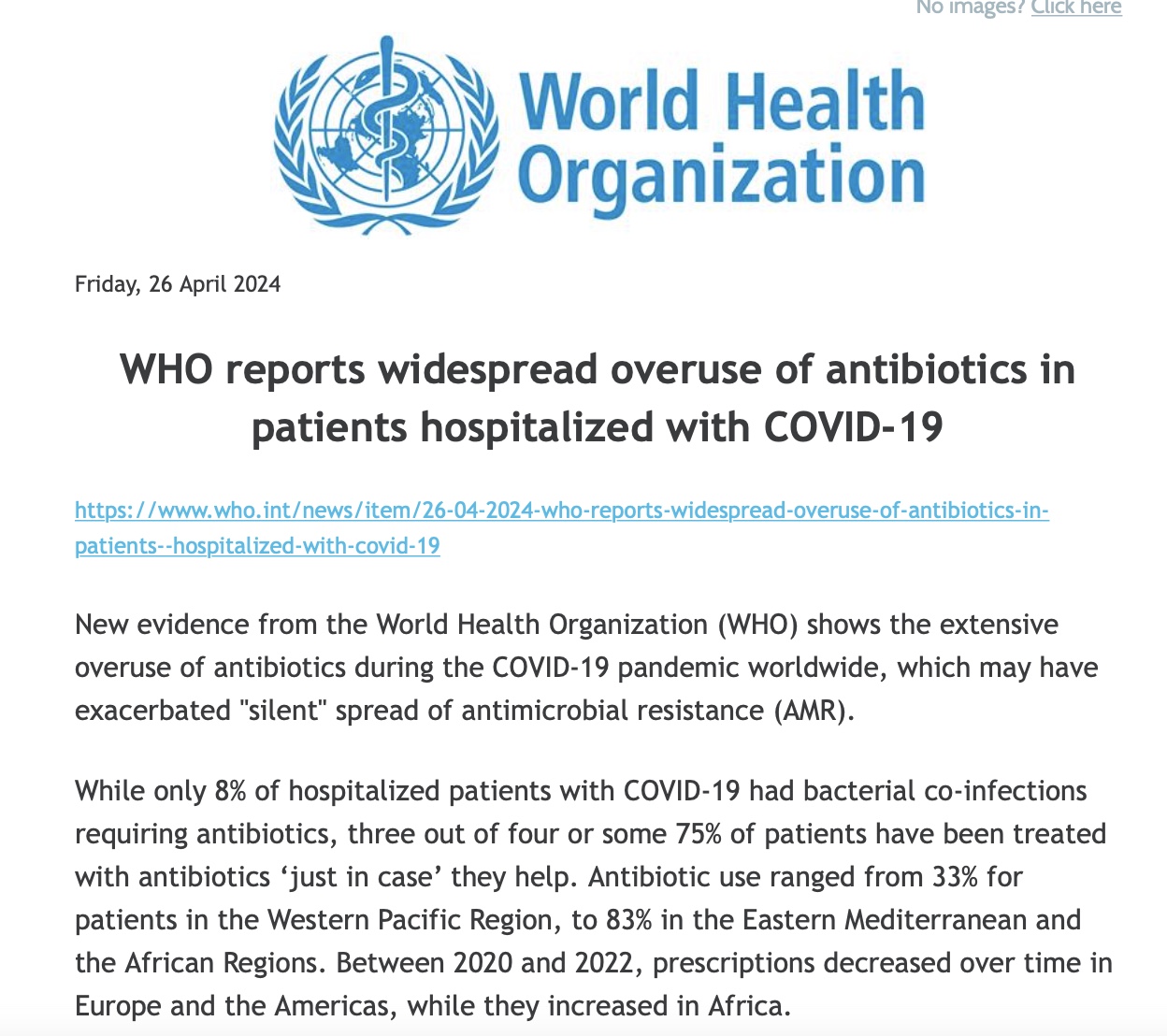 … Highest rate of antibiotic use was seen among patients with severe or critical COVID-19, with a global average of 81%. In mild or moderate cases, there was a considerable variation across regions, with the highest use in the African Region (79%).