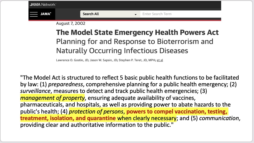 Laws that almost all states passed after 9/11/01, drafted by Georgetown health law professor Lawrence O. Gostin, paid for by the CDC, which many said were unconstitutional. Then Gostin bragged about his bill in the JAMA.