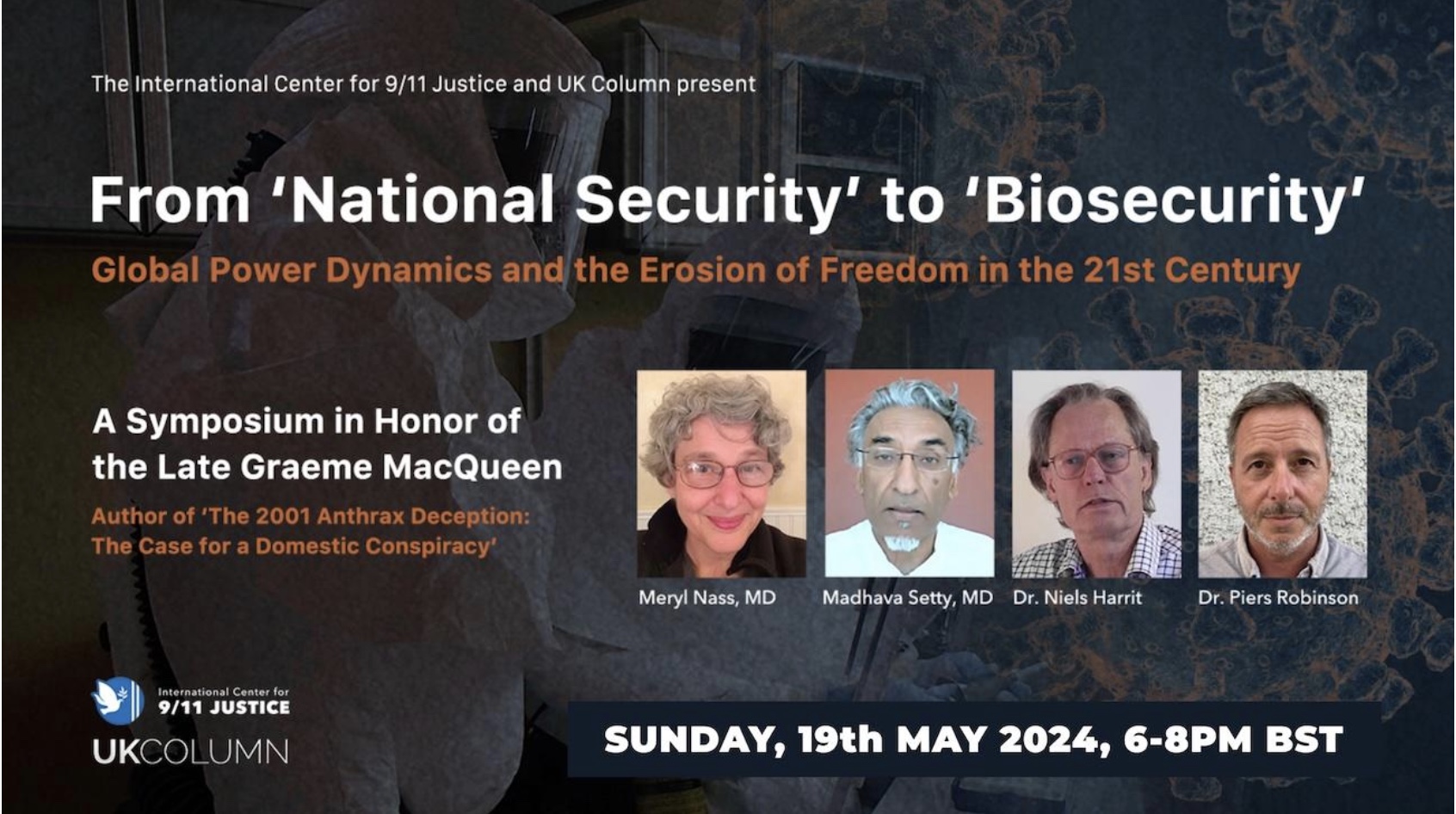 Join the International Center for 9/11 Justice and UK Column this Sunday 19th May at 6:00 PM UK for an online symposium exploring the connections between 9/11 and Covid-19.