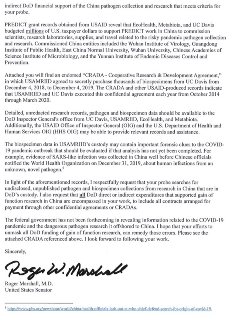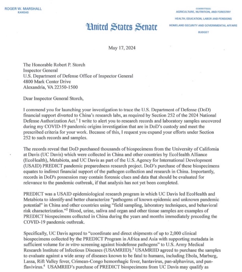 Sen. Roger Marshall reveals that DOD paid UC Davis for thousands of "biospecimens" the USG had already paid $200 million to be collected, from 2014-2020. See my post from one year ago