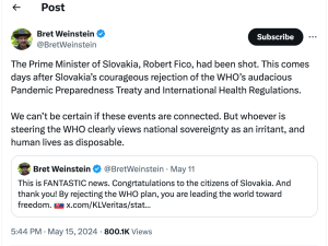 Recently, he was part of perpetuating an astonishing conspiracy linking the attempted assassination of Slovakian Prime Minister Robert Fico with that country’s “courageous rejection of the WHO’s audacious Pandemic Preparedness Treaty and International Health Regulations”.