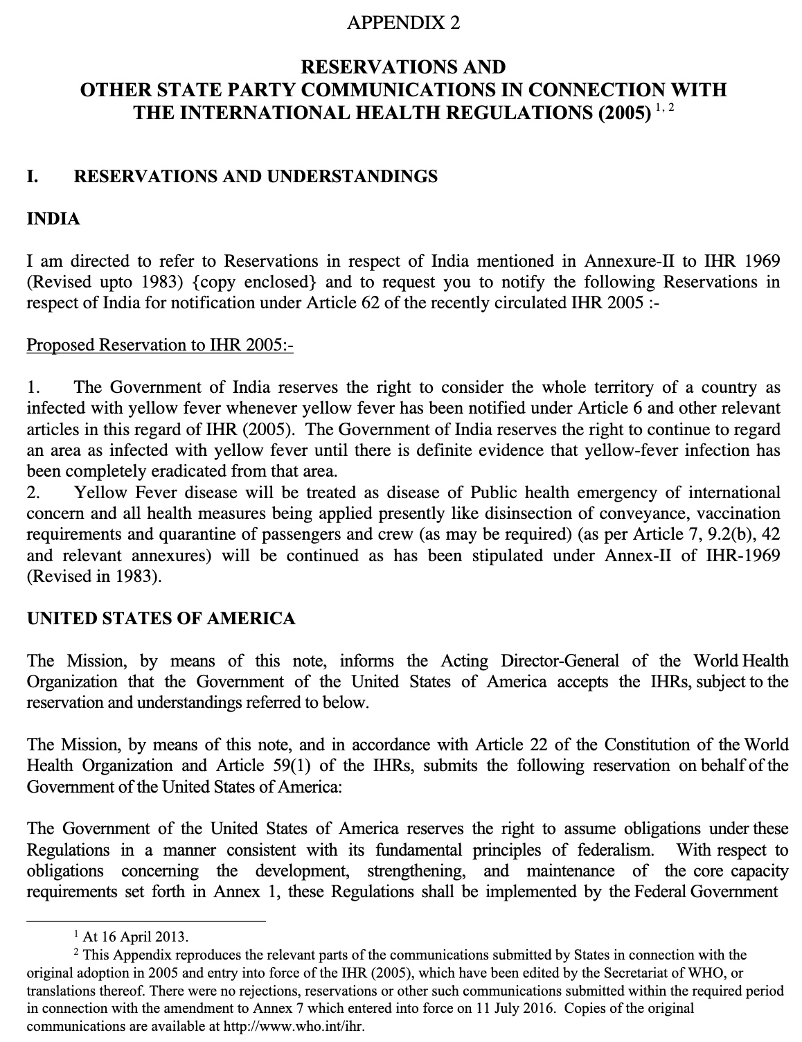 The International Health Regulations (IHR, 2005) are a treaty that the US is a party to. But the US removed itself from meeting the obligations contained in the treaty through issuing the following reservations, found on pages 60-61 of the IHR or on the State Department website. We “accept” the IHR but only “subject” to the following: