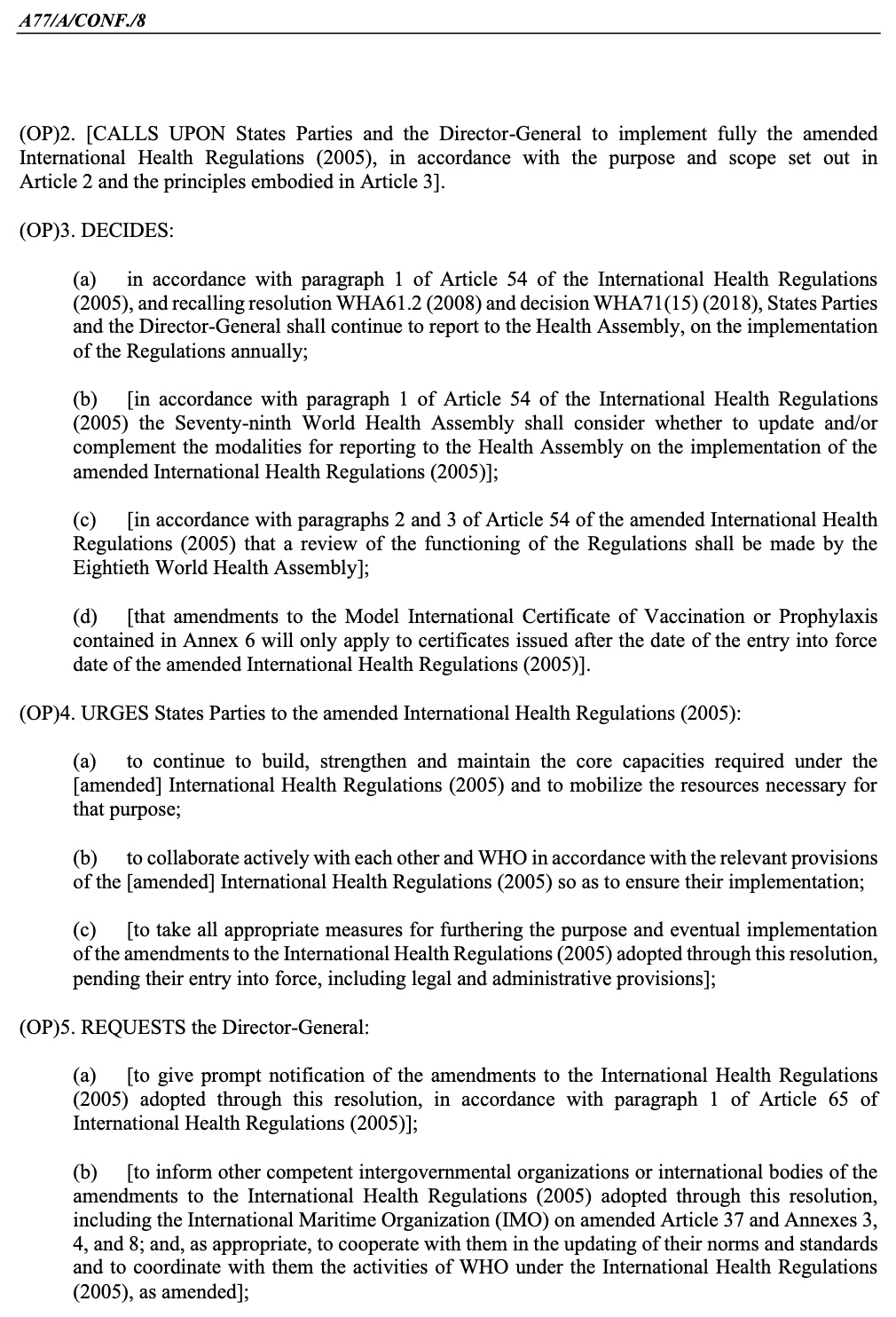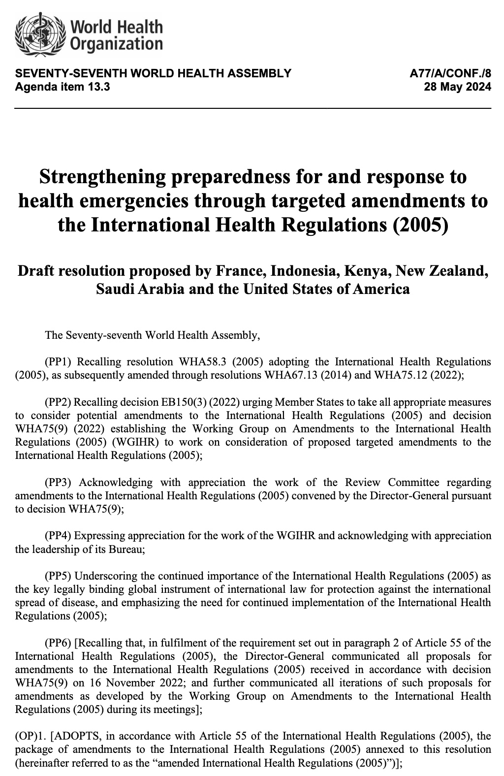 Example #1. Here is a resolution the US and a handful of its hangers-on proposed for the WHA to approve today. It is so full of references to other documents (by number) that it is impossible to tell what it is actually asking the members to commit to. And, since it was only proposed today (but no doubt most of it was prepared earlier) the member nations have little time to carefully review it in light of the packed agenda of the week, with meetings scheduled during 12 hours a day.