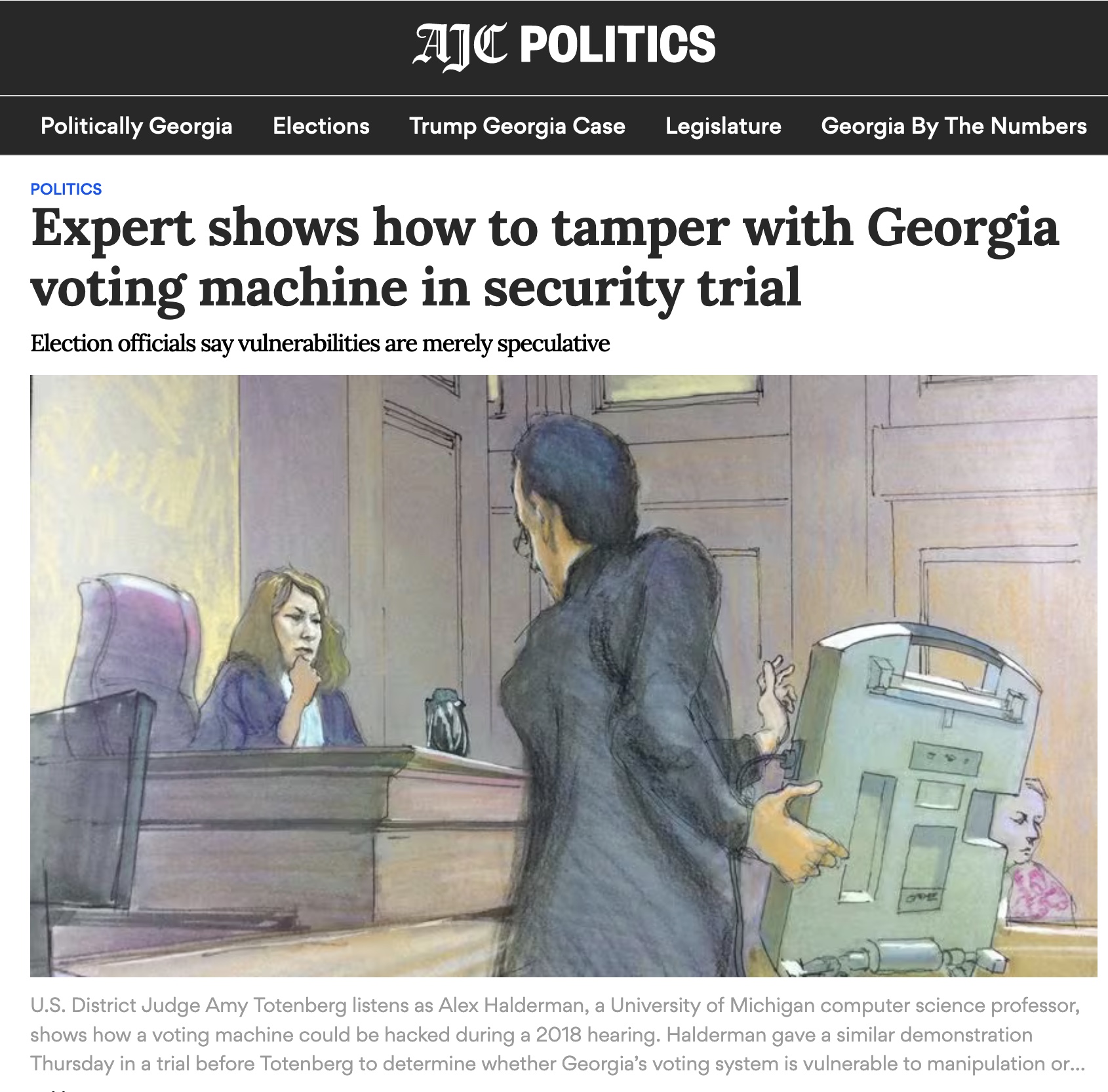Huddled around a voting machine in a federal courtroom, a small crowd watched as expert witness Alex Halderman demonstrated how someone could meddle with a Georgia election within seconds.