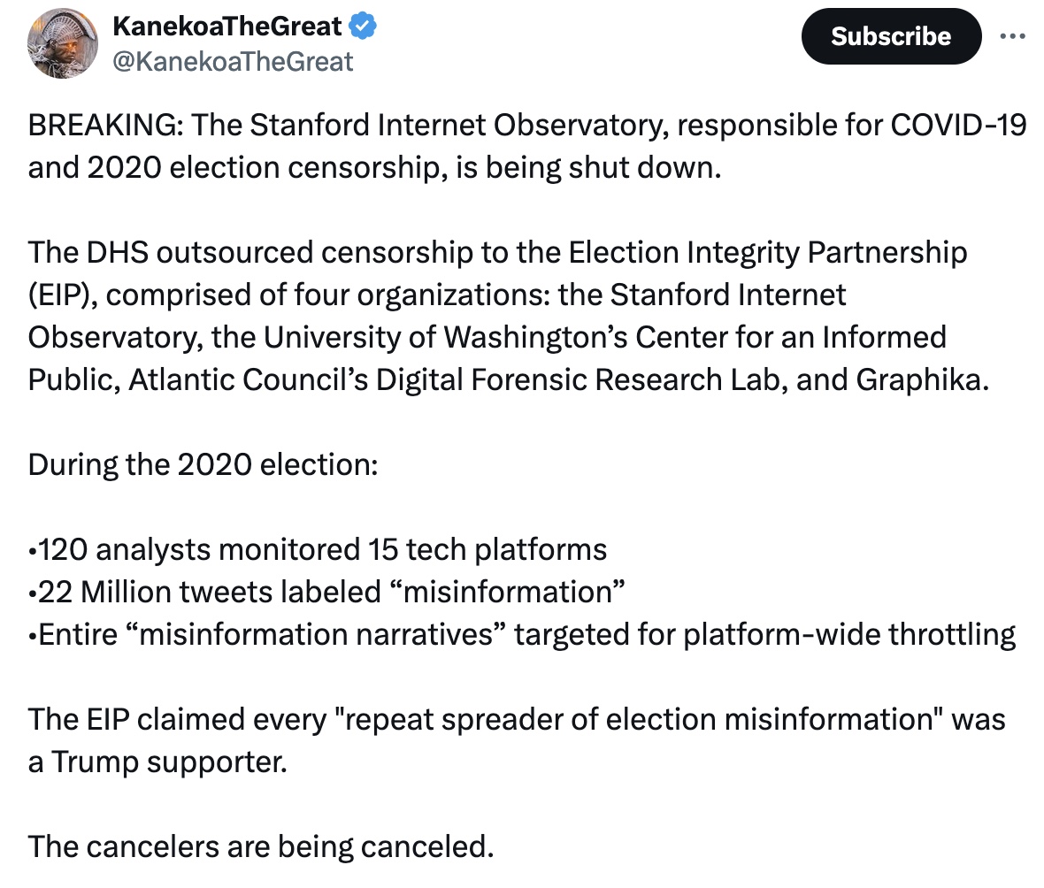 Stanford’s Internet Observatory was a surveillance-censorship operation (discussed previously) that spit on the First Amendment, worked closely with fed intelligence agents and trained students to break the law. God only knows what techniques were developed here in the heart of Silicon Valley to mind control the citizenry.