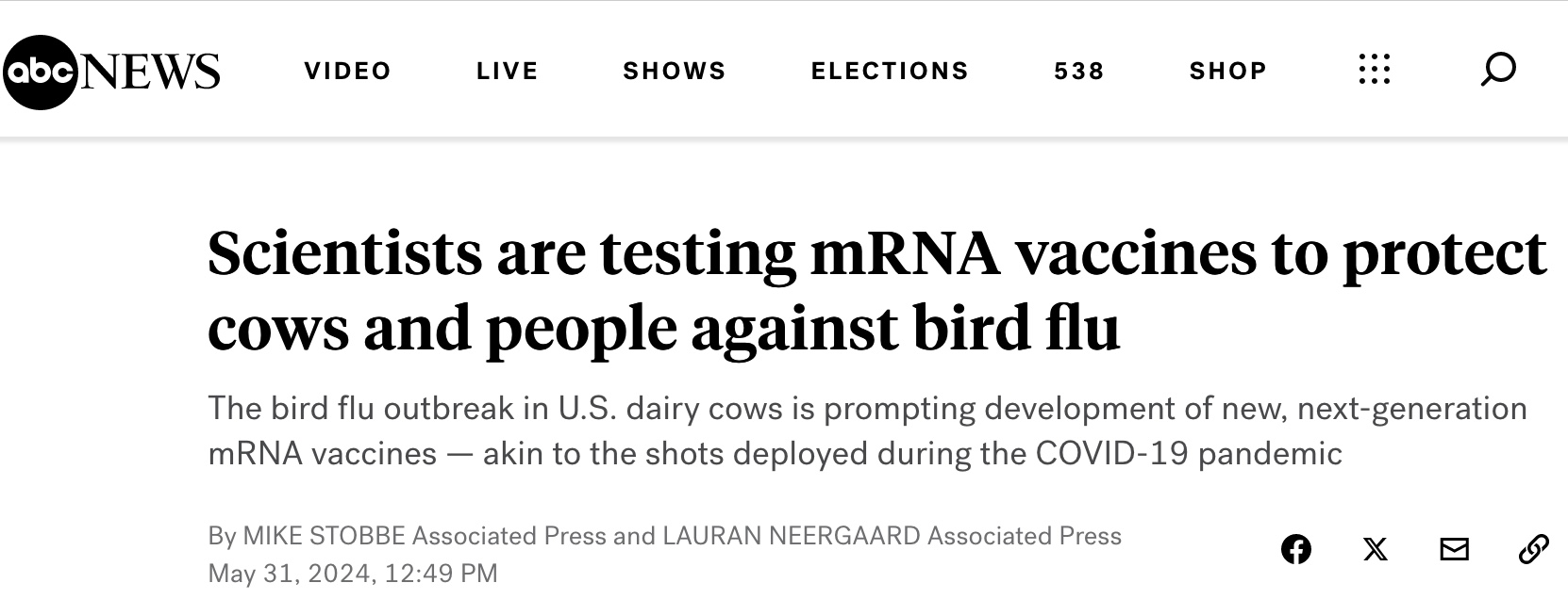 US gov’t (USDA) is testing mRNA vaccines in cows starting now–to protect them from bird flu