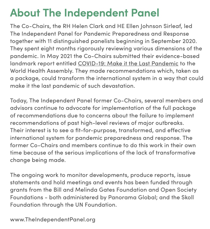 The Independent Panel is independent from whom, exactly? This was the group that Tedros promised would investigate the WHO’s recommendations during the pandemic. They didn’t. They just wrote a puff piece laying out the case for a pandemic treaty.