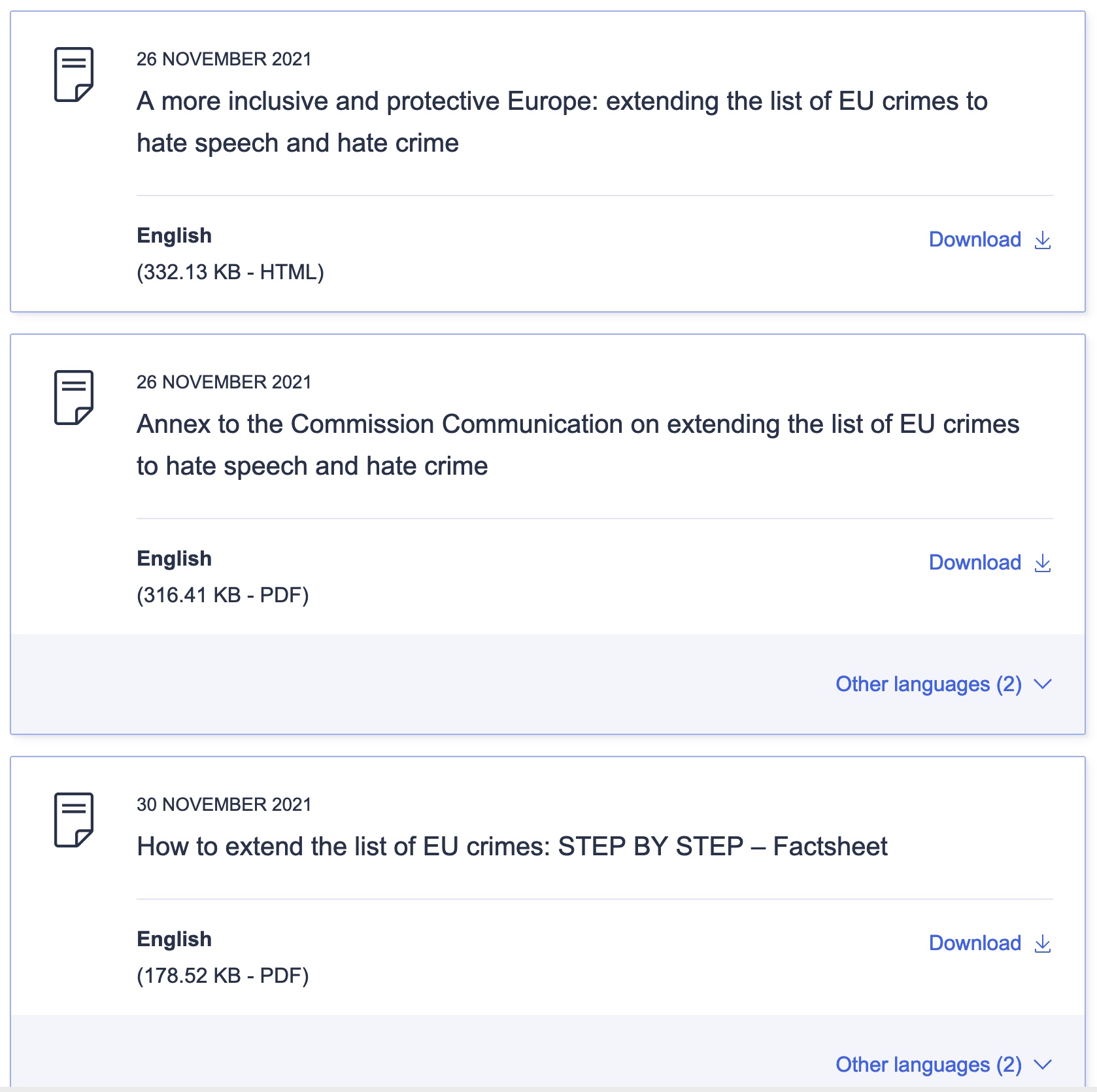 The Commission considers that hate speech and hate crime are particularly serious crimes because of their harmful impacts on fundamental rights, on the individuals and on society at large, undermining the foundations of the EU.